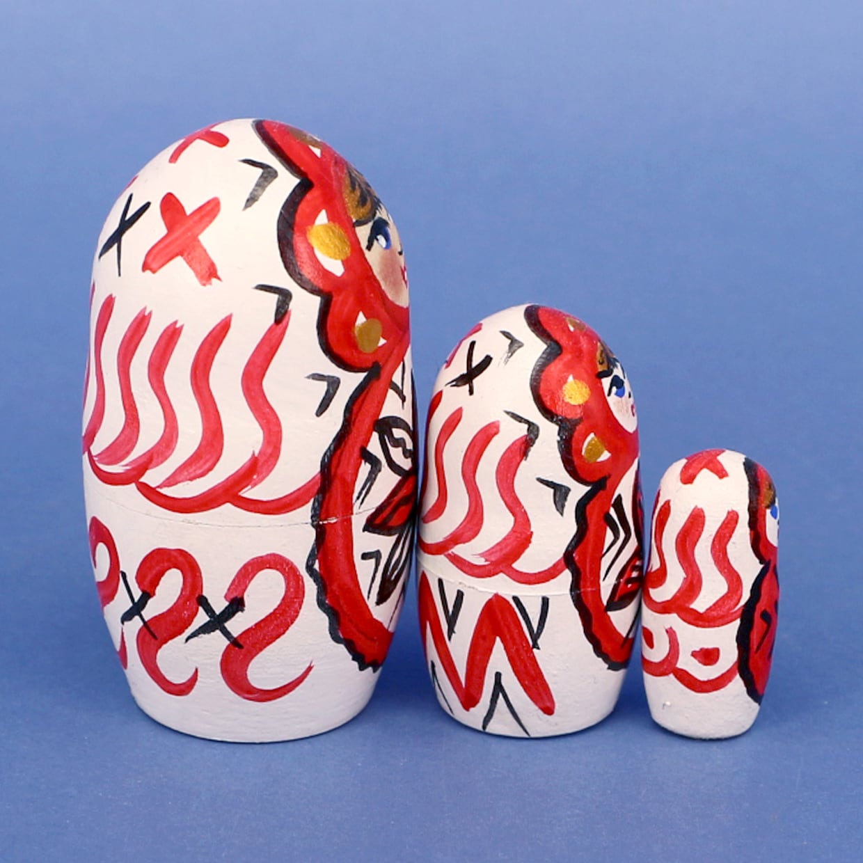 赤と白を基調とした、アルハンゲリスク模様の女の子のマトリョーシカ。