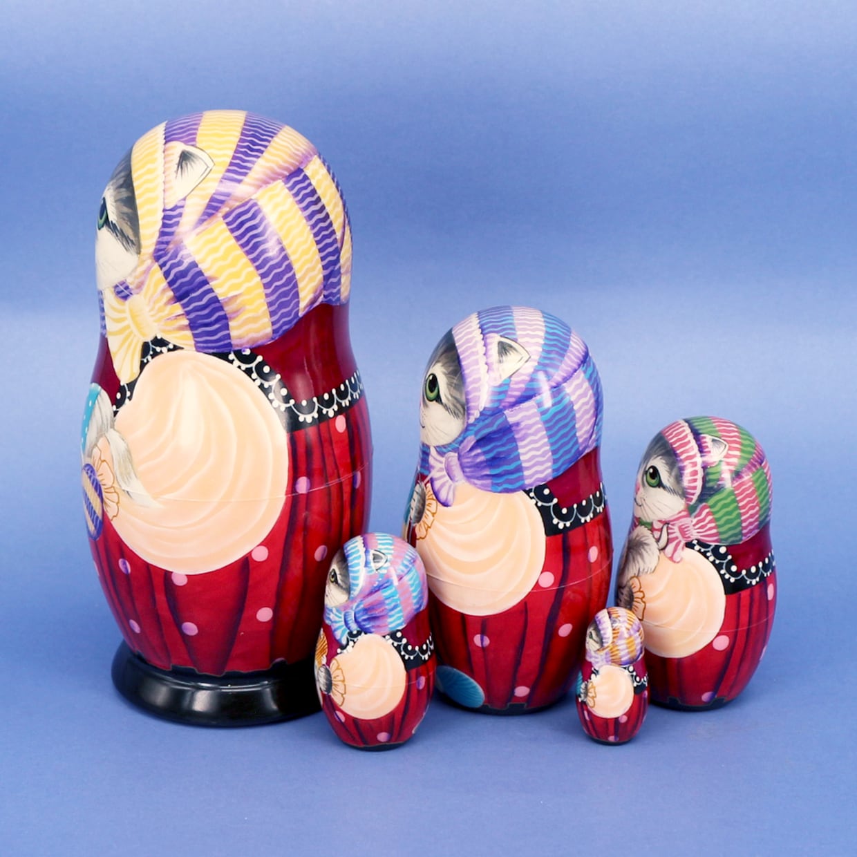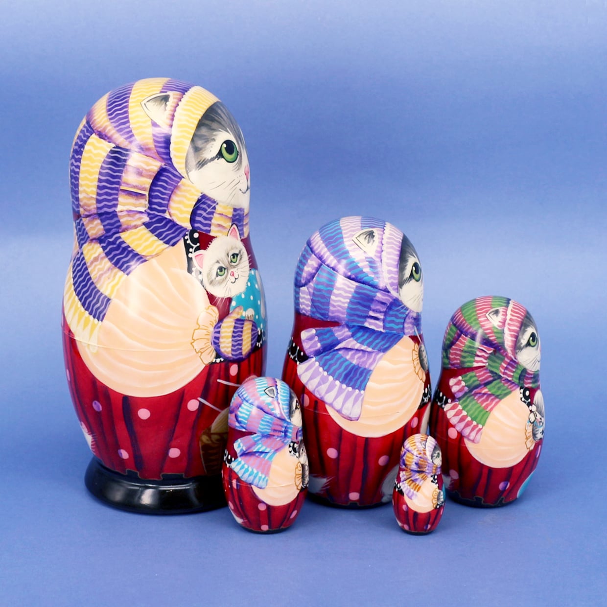 5匹のネコちゃんが縞模様のマフラーを頭までぐるりと巻いている姿があたたかそうです。