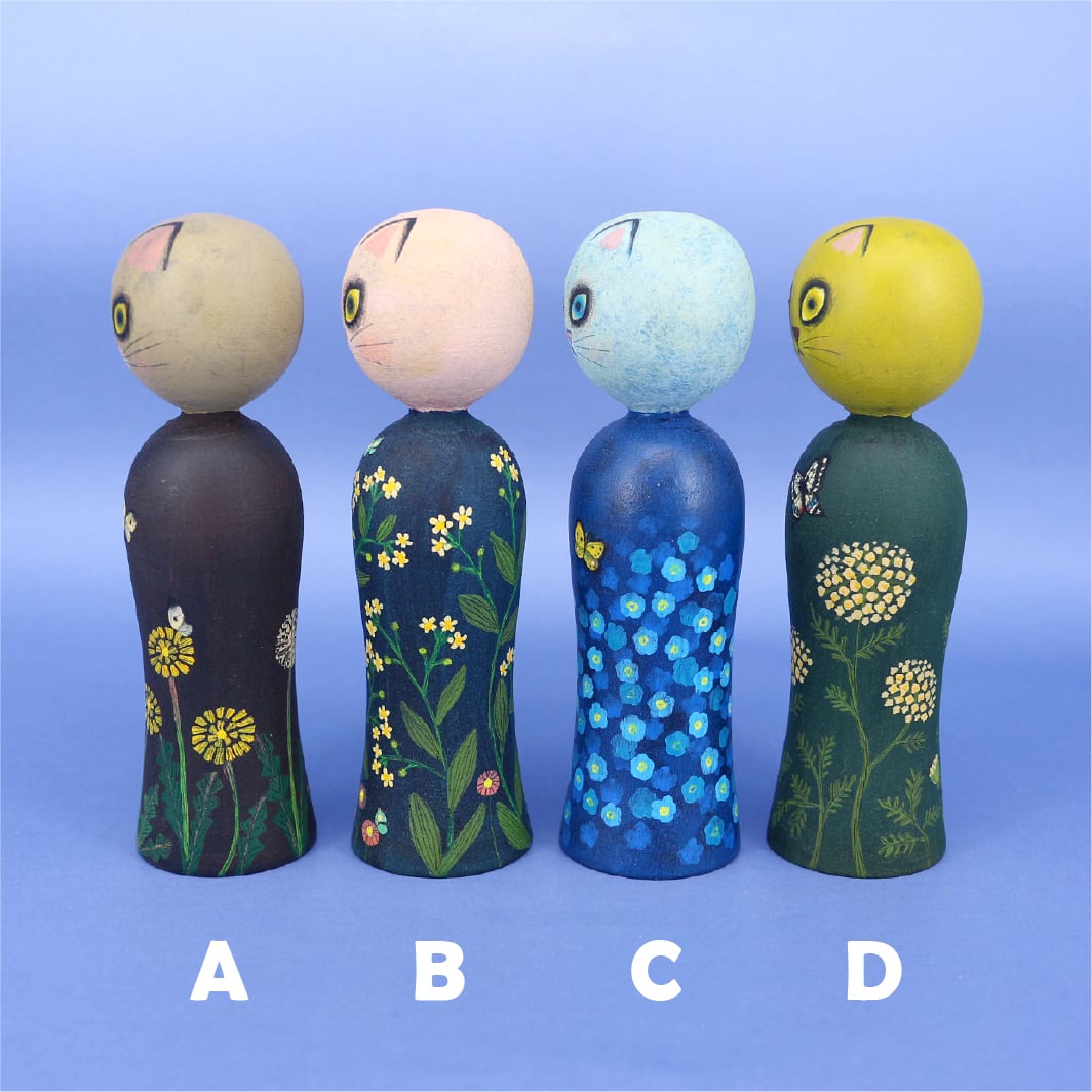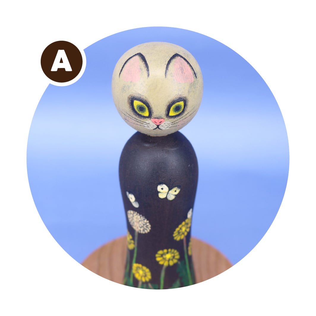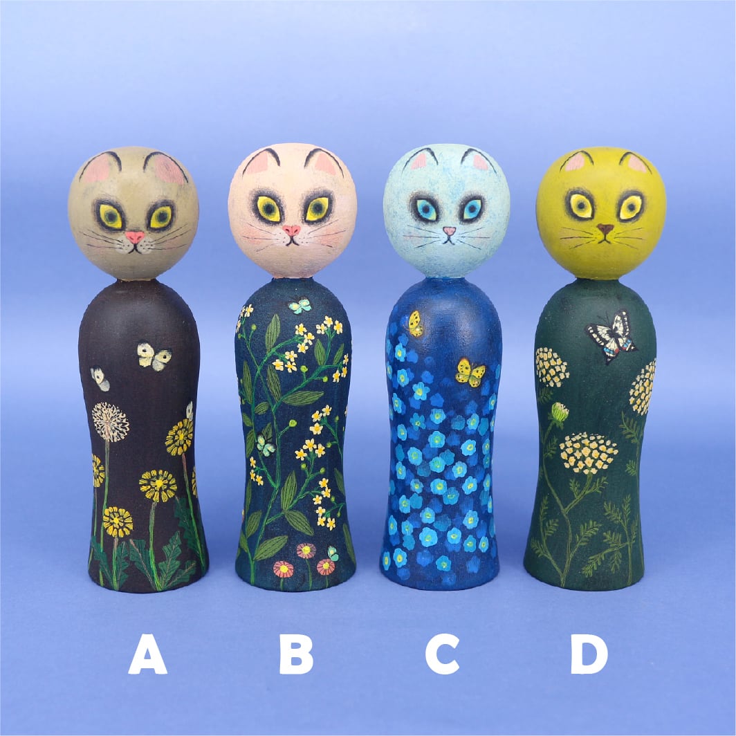 こけしの頭部分がネコになっており、胴体部分には蝶々の飛んでいる草花の風景が描かれた作品です。