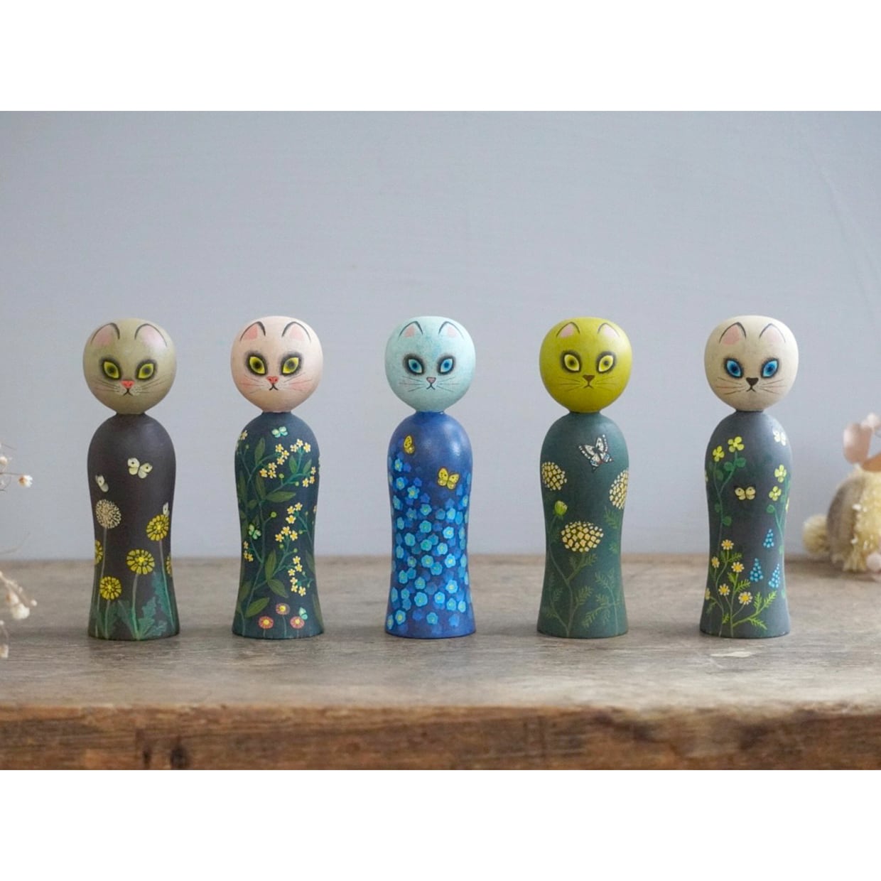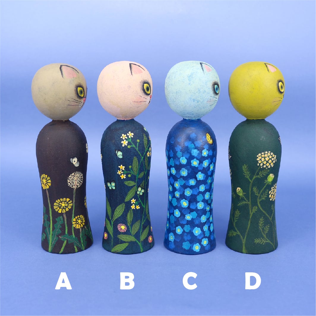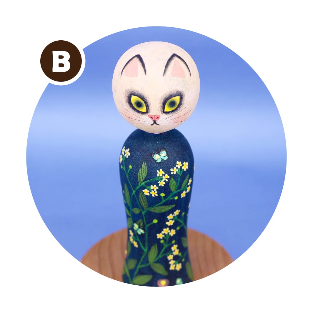 こけしの頭部分がネコになっており、胴体部分には蝶々の飛んでいる草花の風景が描かれた作品です。