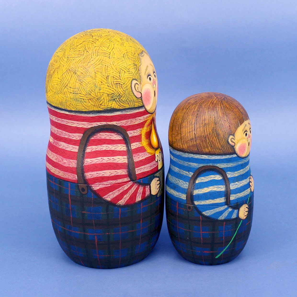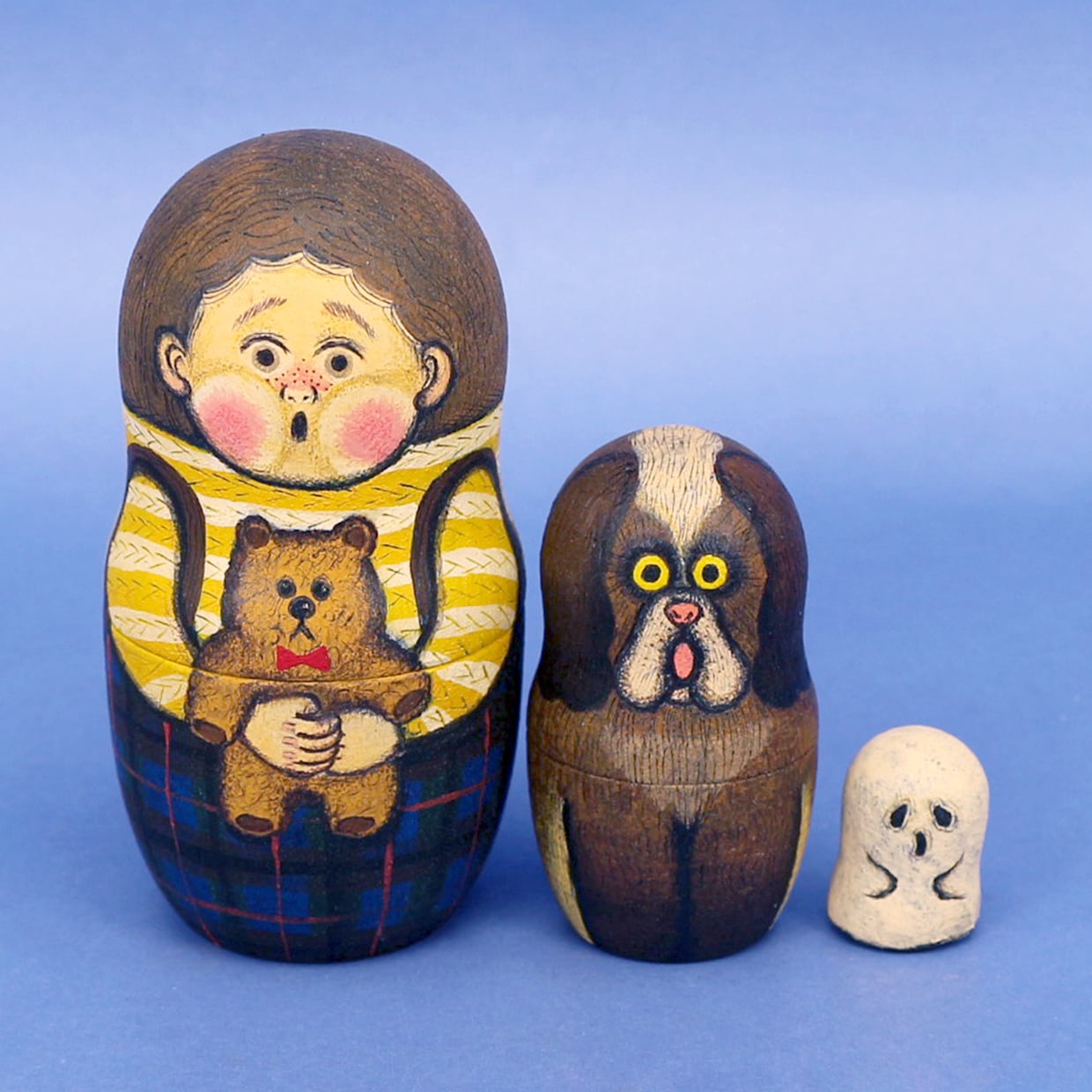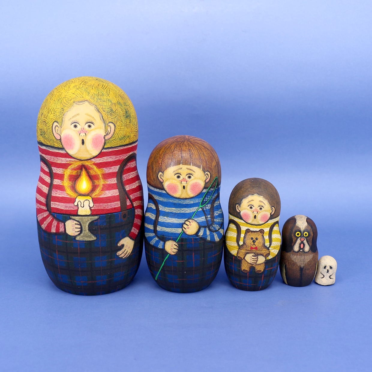 絵本のページをめくるように 開くと次々出てくるマトリョーシカに 物語を込めて絵付けしました