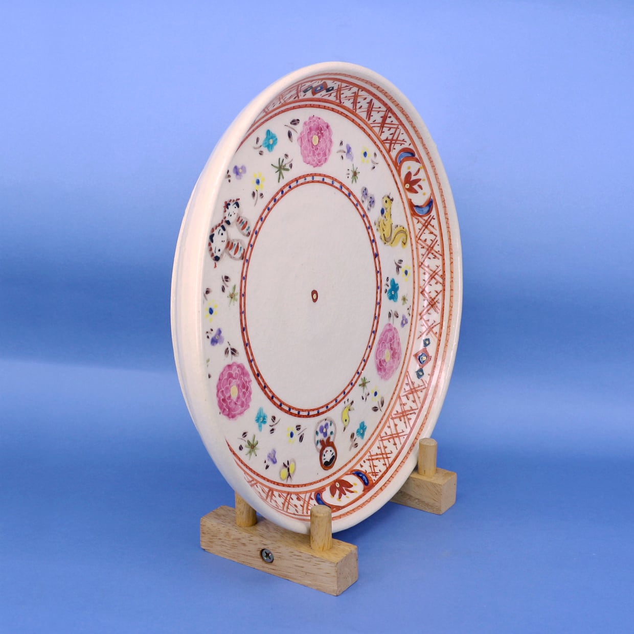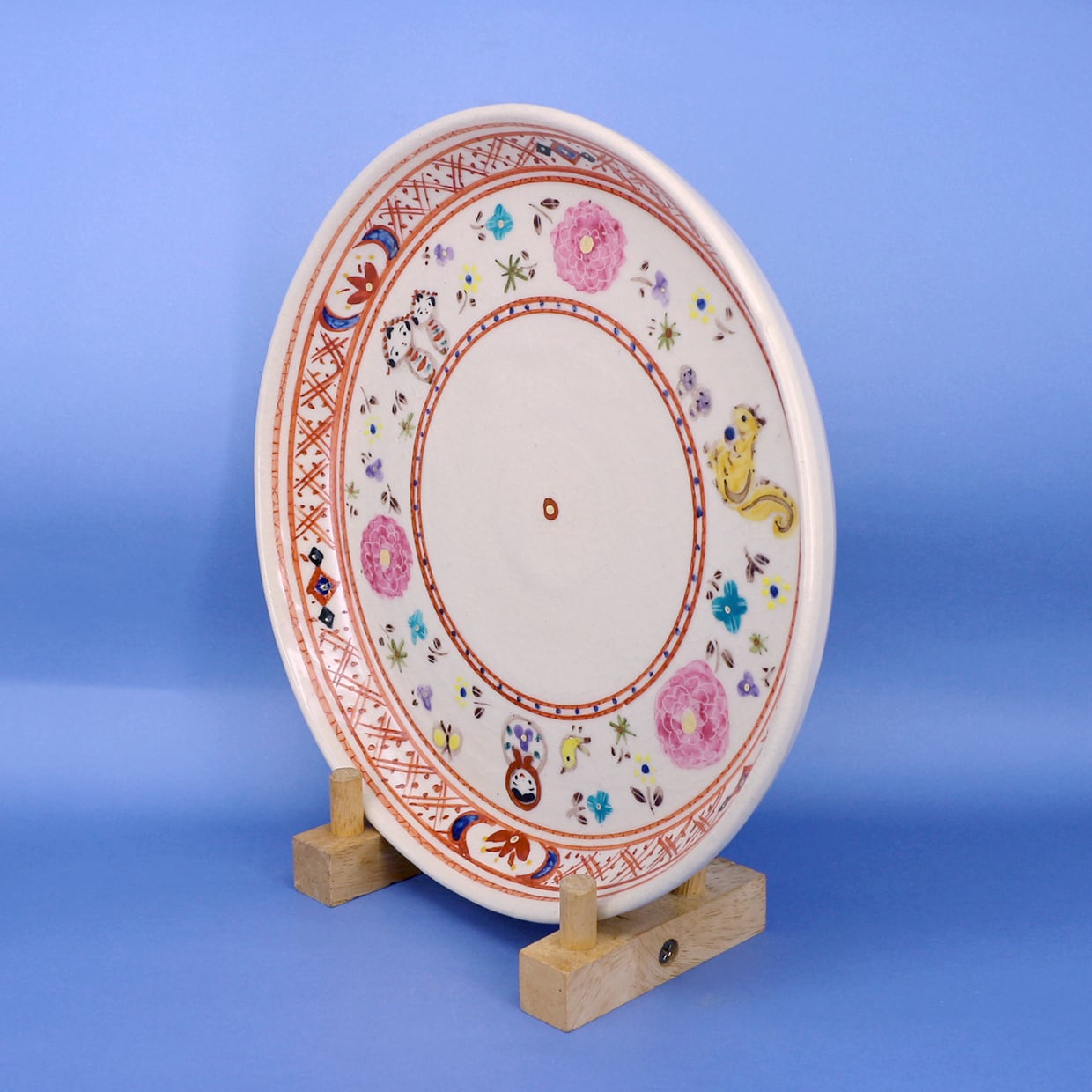 赤色を主に使った絵付けの赤絵作品で、お皿の周囲に描かれている蔵王の森に住むリスやこけし、GINZA HAKKO 木の香からイメージされたマトリョーシカがお料理を引き立ててくれます。