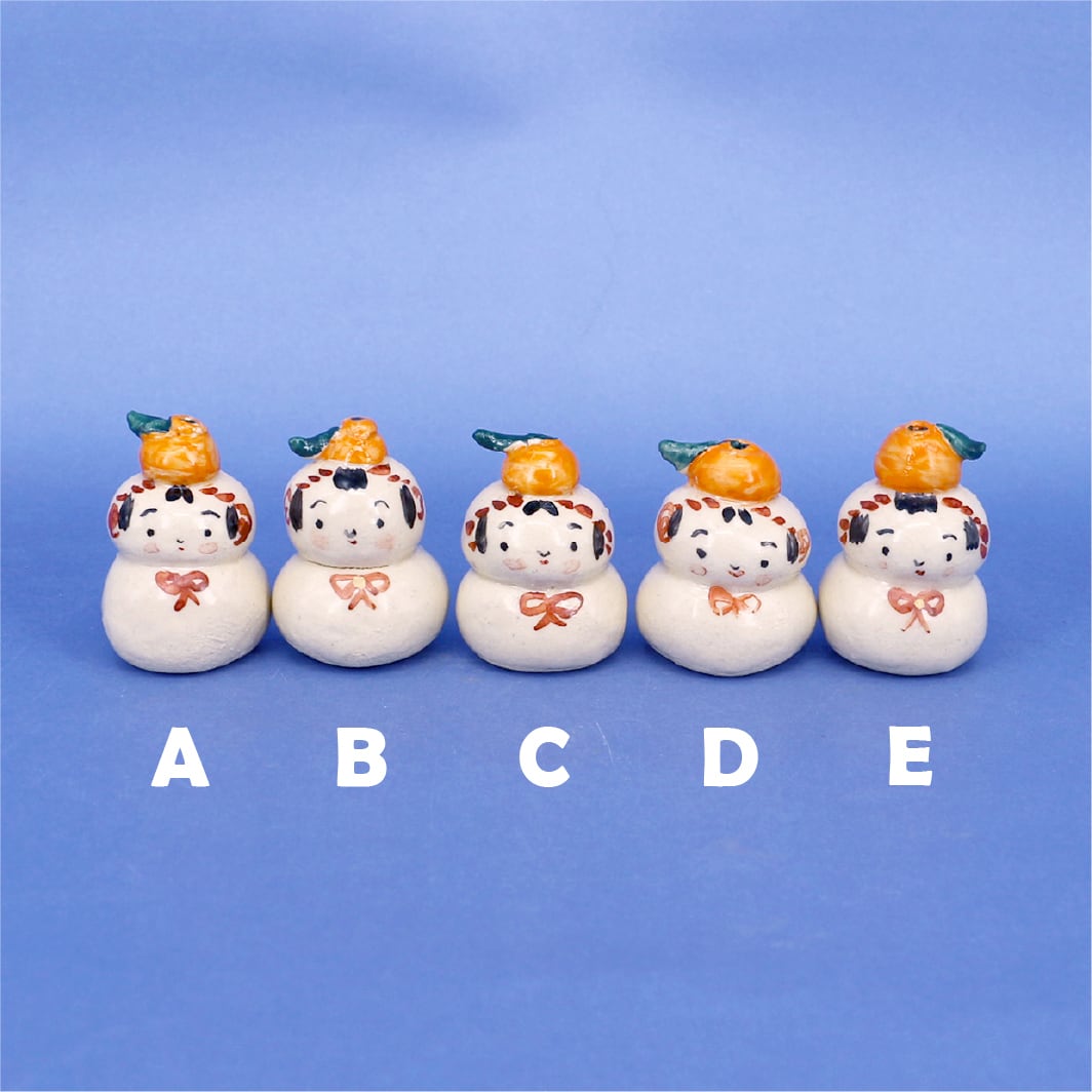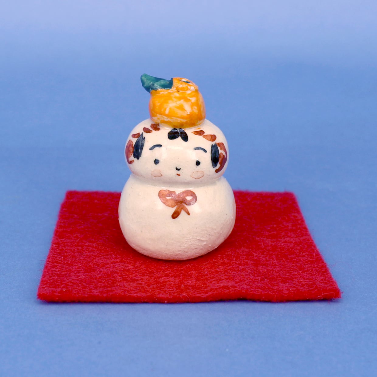手作りのあたたかみが感じられる形をした、鏡餅になったこけしの置物。