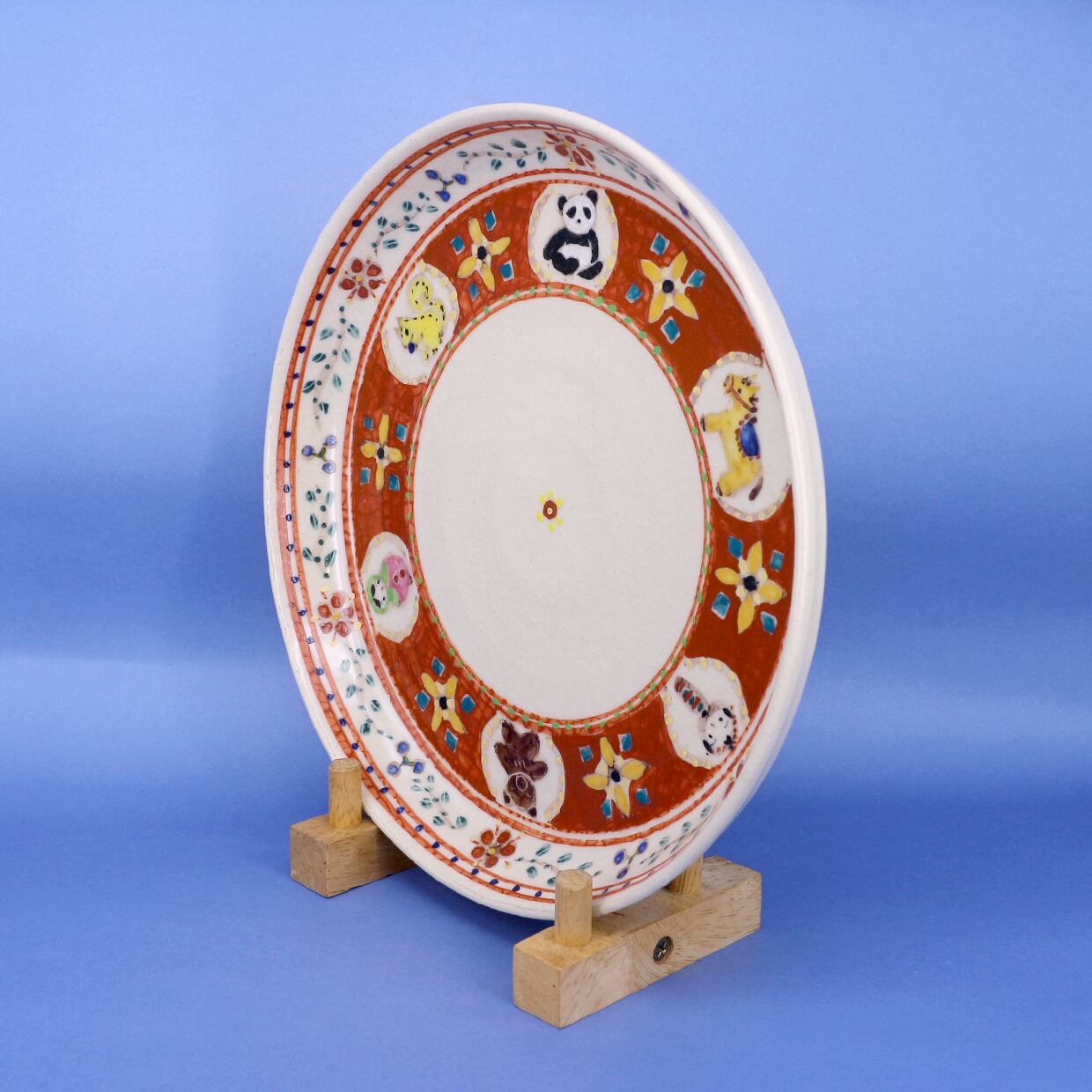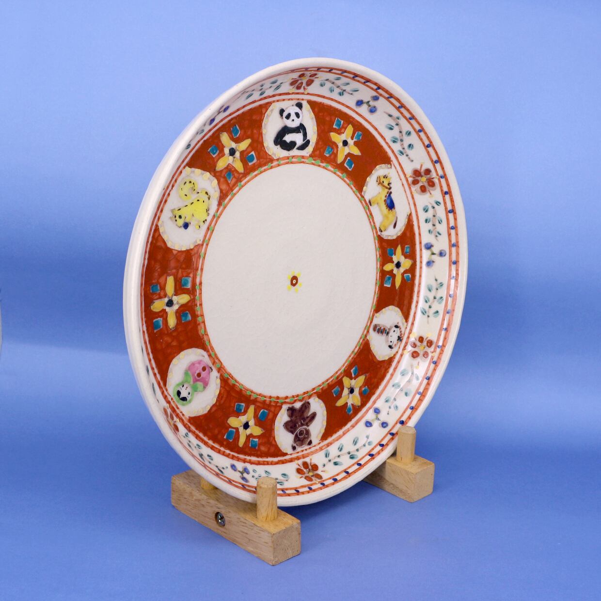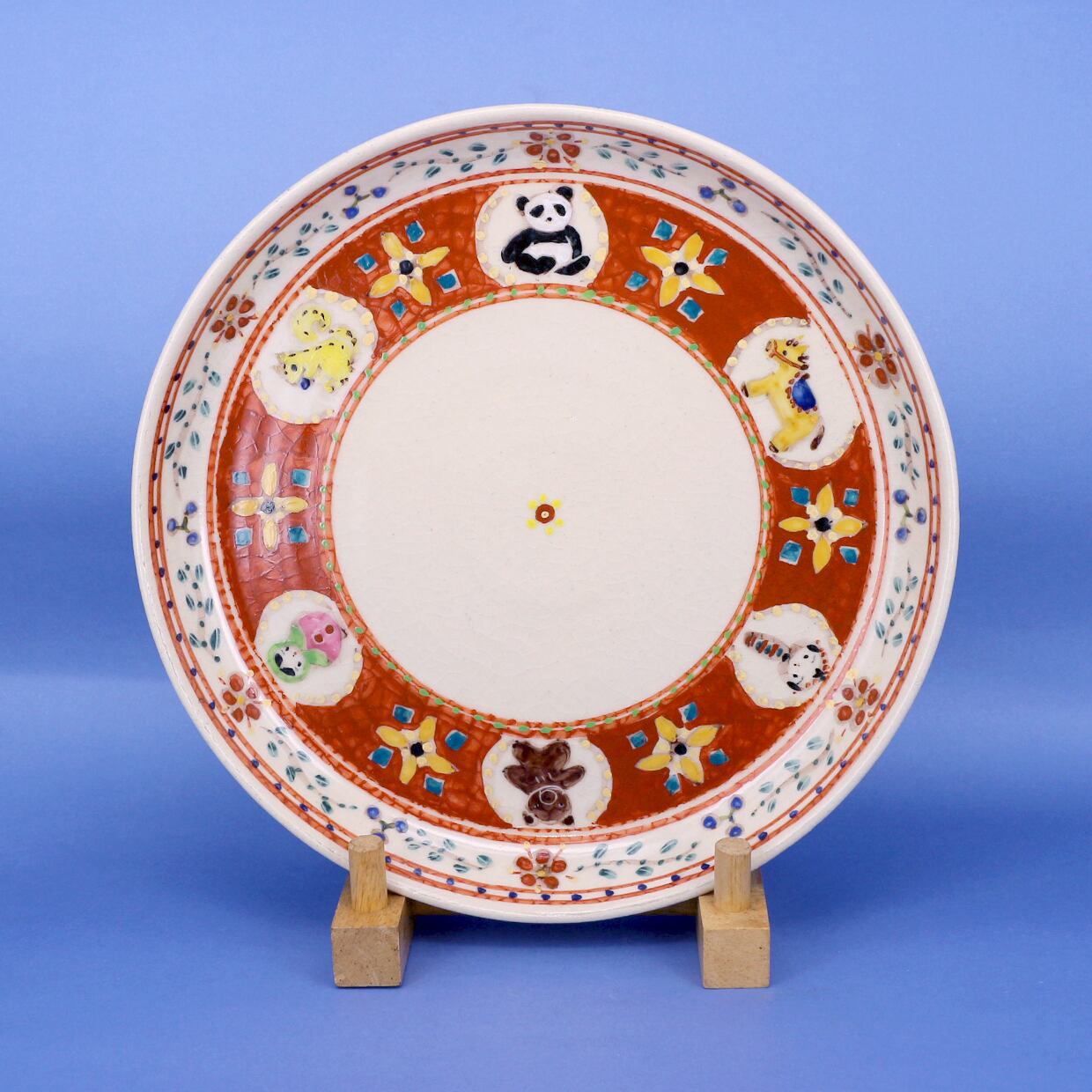 赤色を主に使った絵付けの赤絵作品で、お皿の周囲に描かれた来年の干支でもある馬やパンダ、こけしやマトリョーシカがお料理を引き立ててくれます。