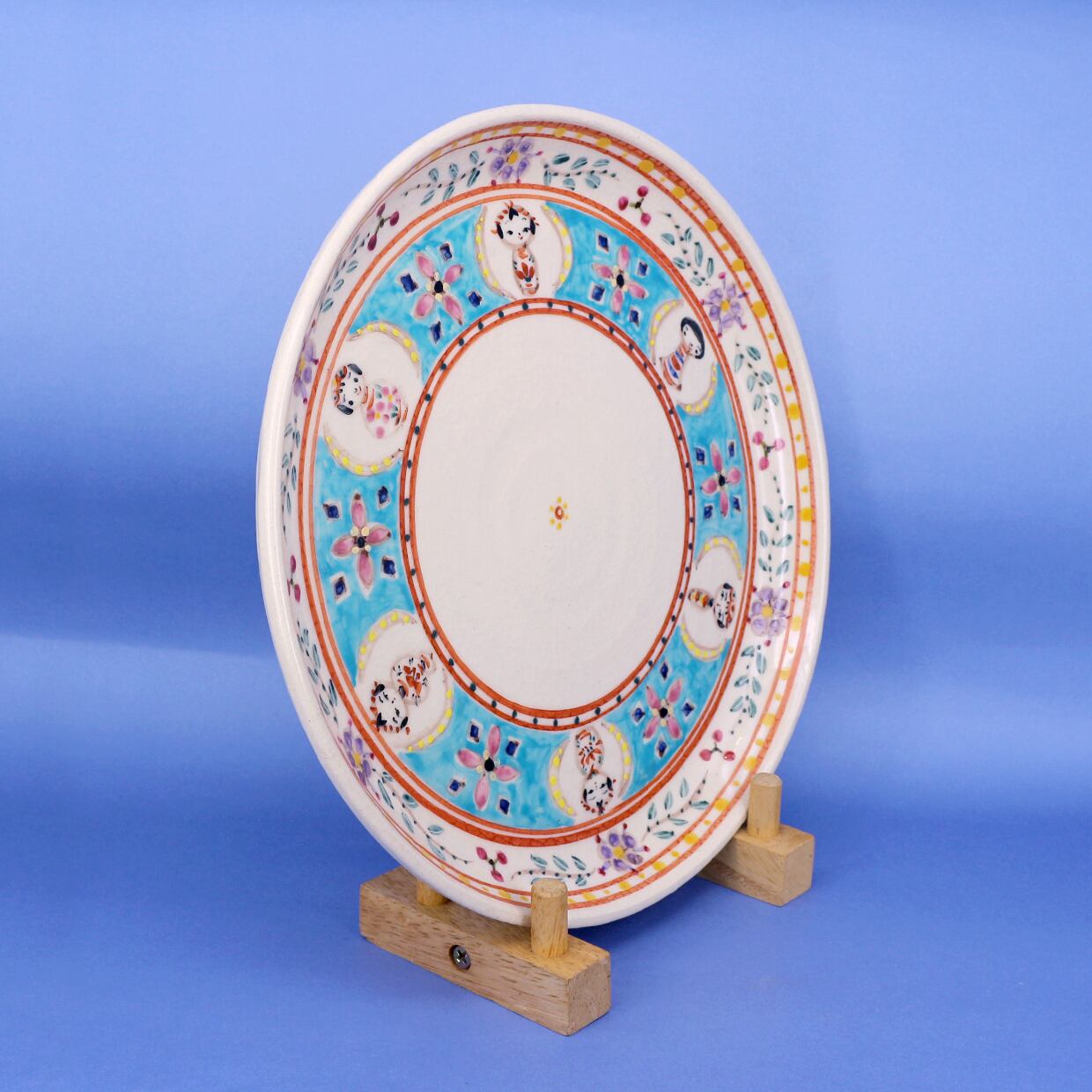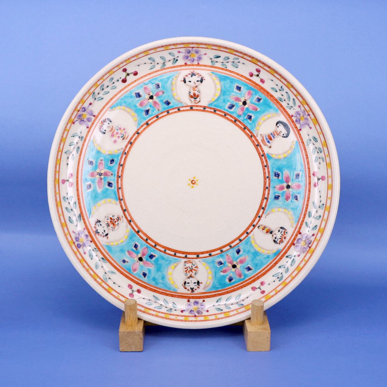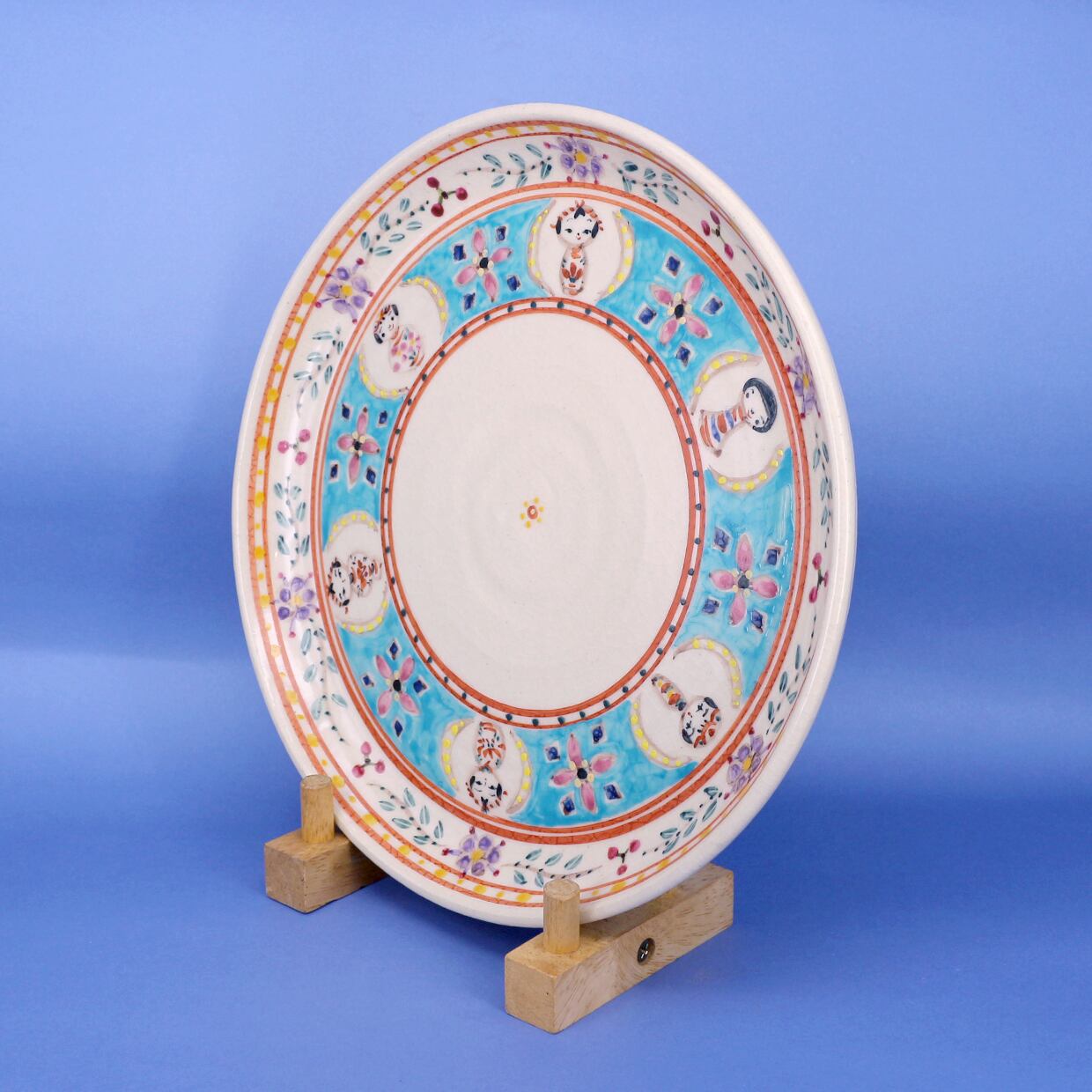 赤色を主に使った絵付けの赤絵作品で、お皿の周囲に描かれているこけしと爽やかな青色がお料理を引き立ててくれます。