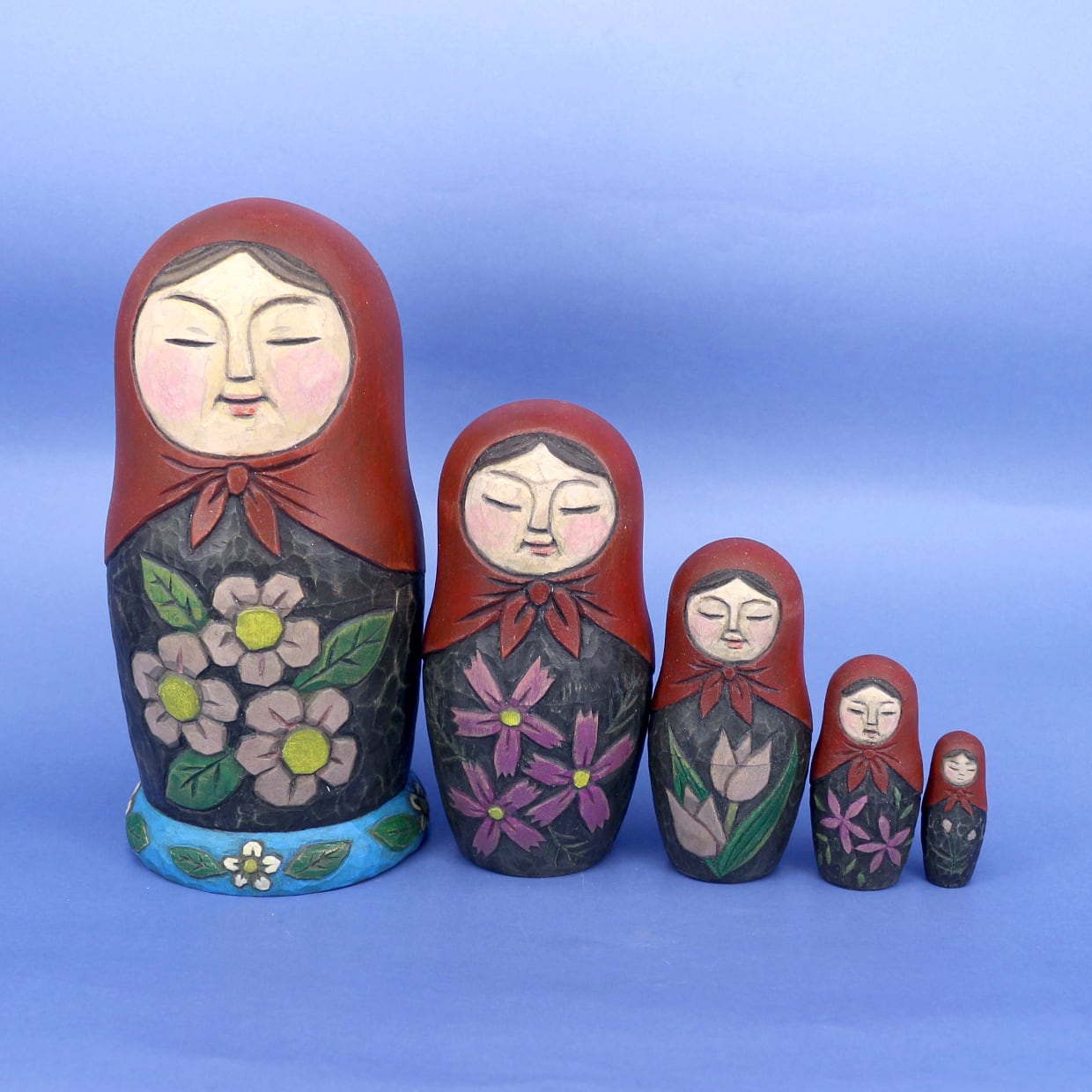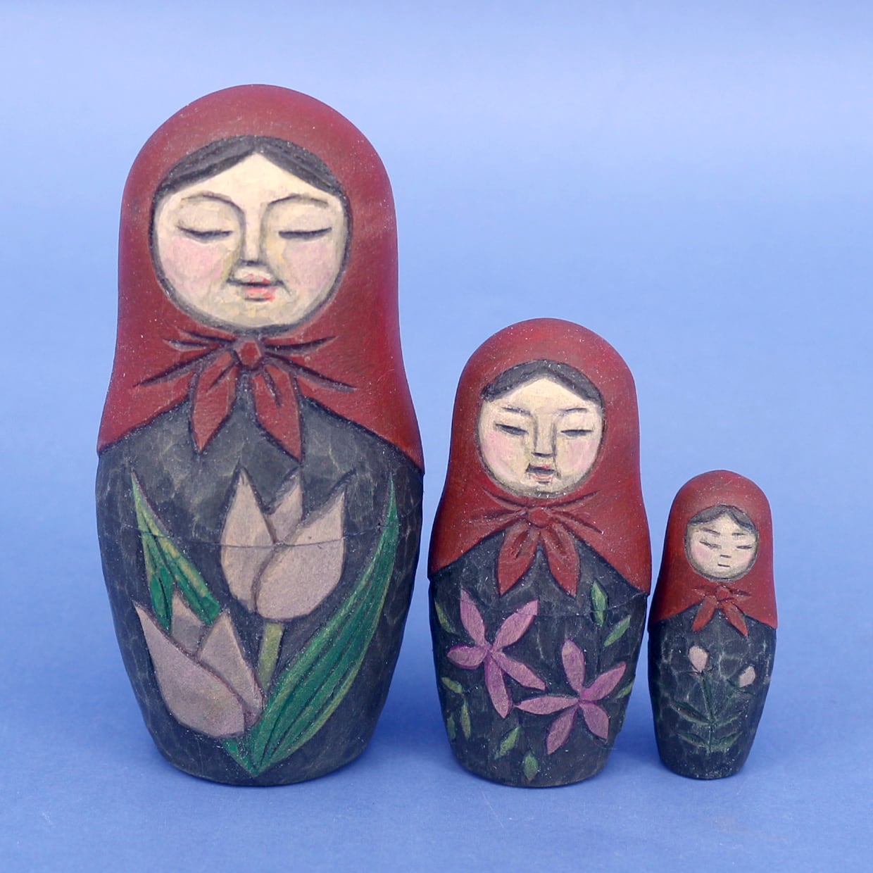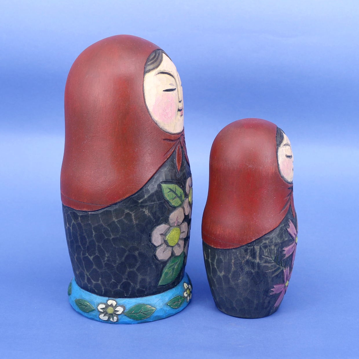 マトリョーシカは入れ子にするためにそれぞれの木地を薄く削る必要があり、そこに彫刻を施すのは実はとても難しい技術です。