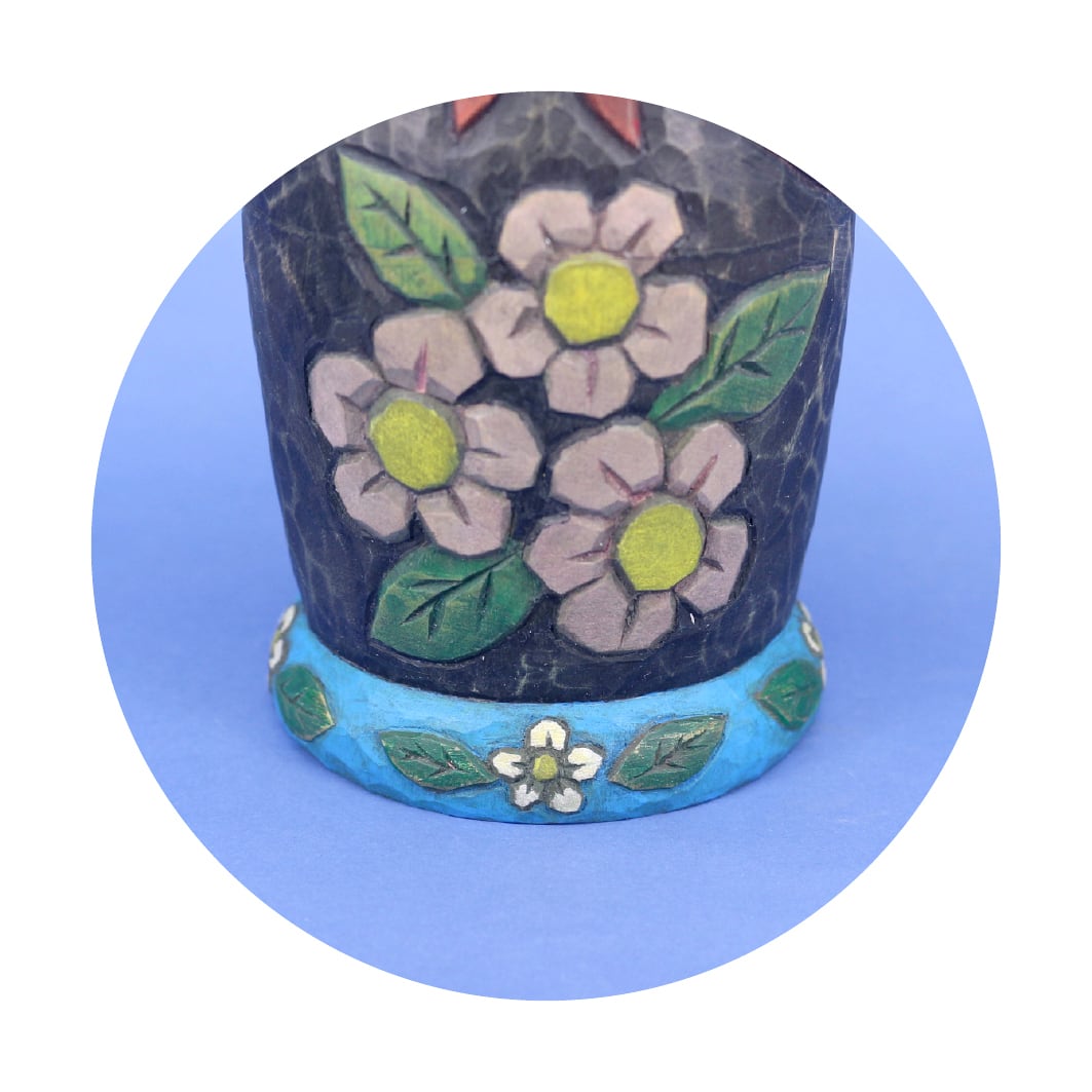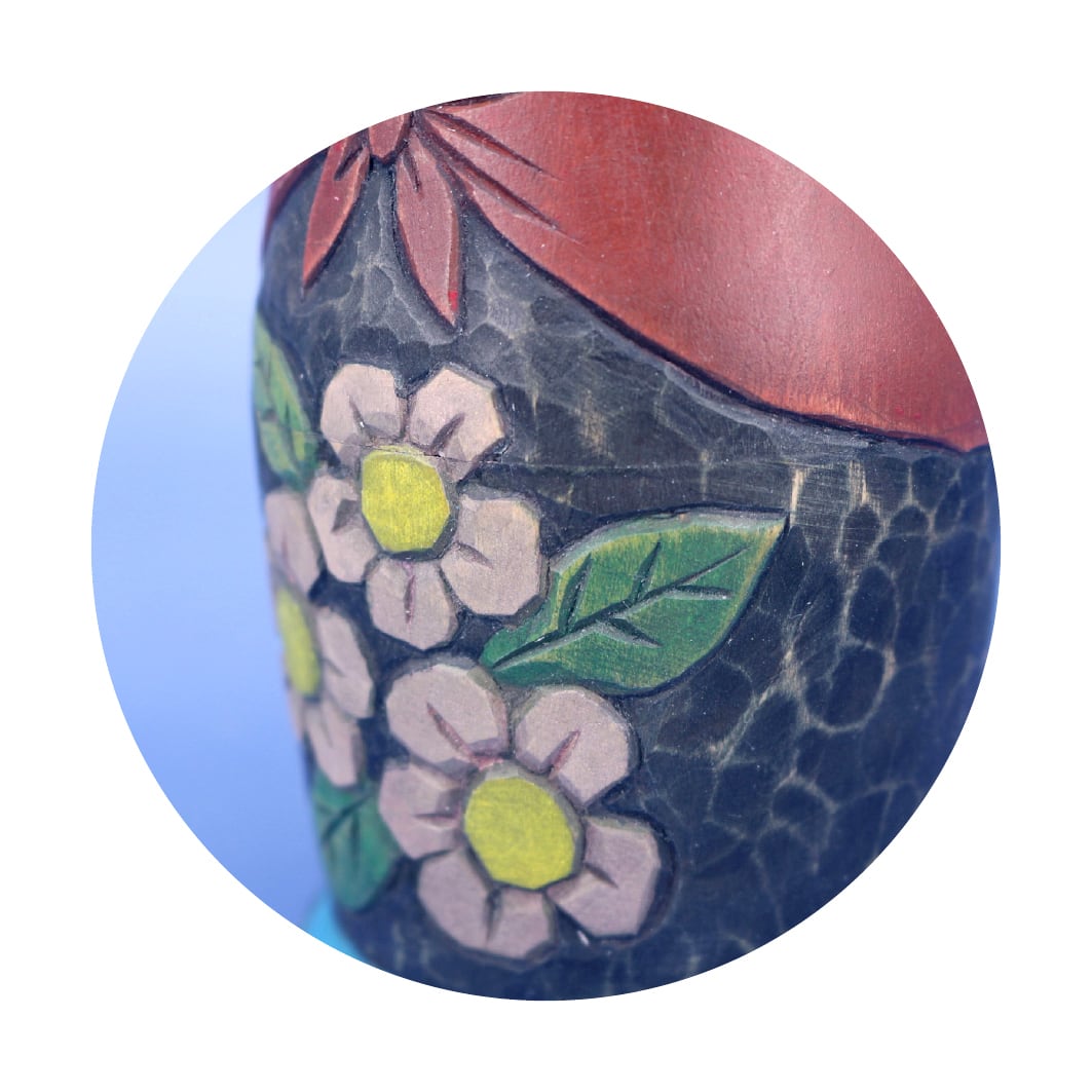 手彫りならではのあたたかみを感じられる静かな表情や、お腹の部分に彫られた素朴な花々が、どんなインテリアのお部屋にも調和してくれそうです。