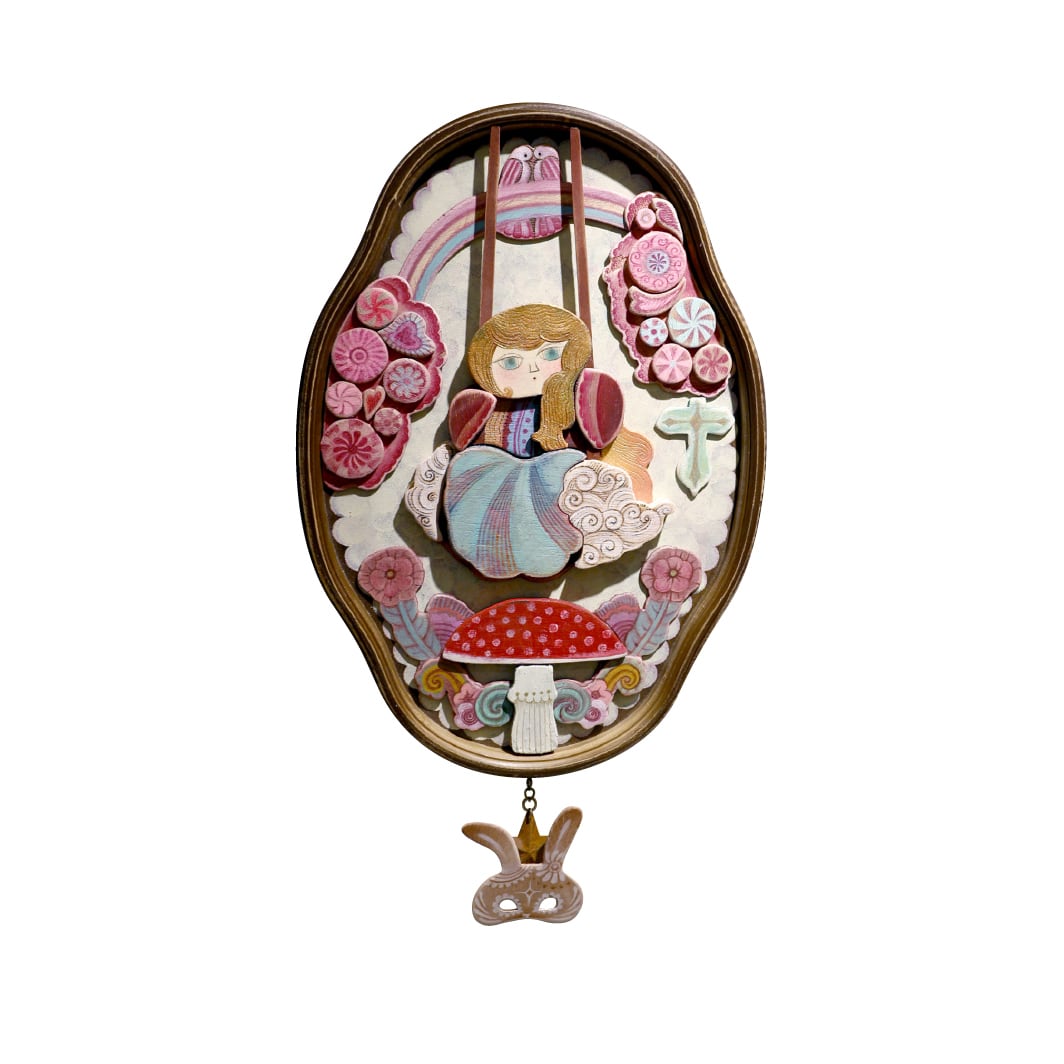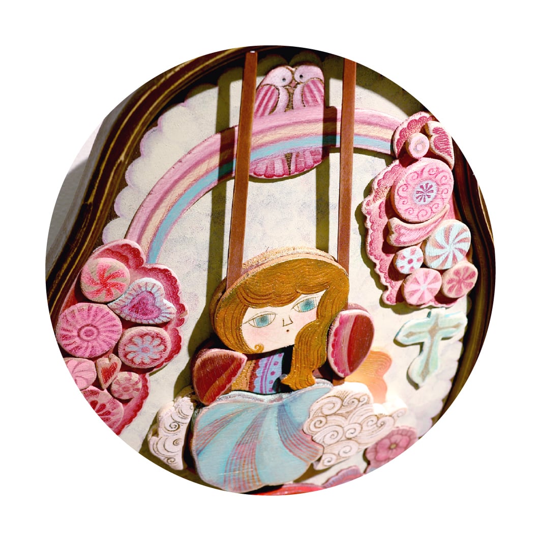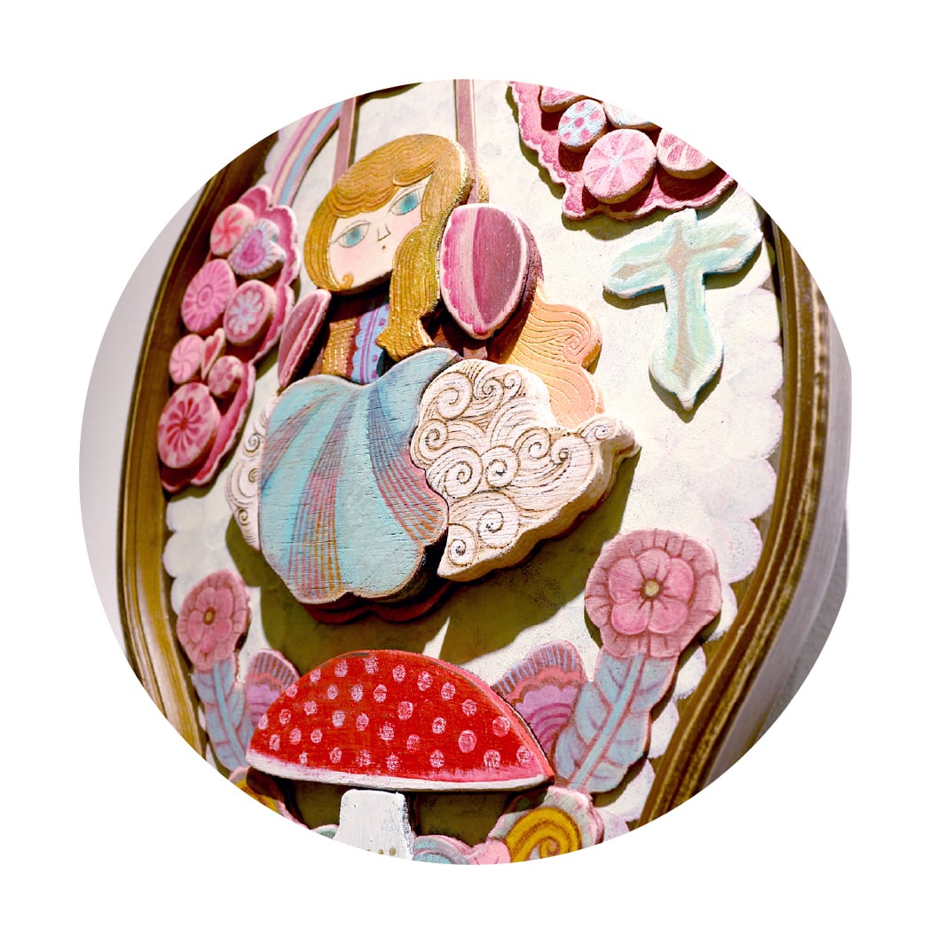 取り外してお顔や組木絵内に付け替えることができるので、お好みに合わせて飾ってお楽しみください。