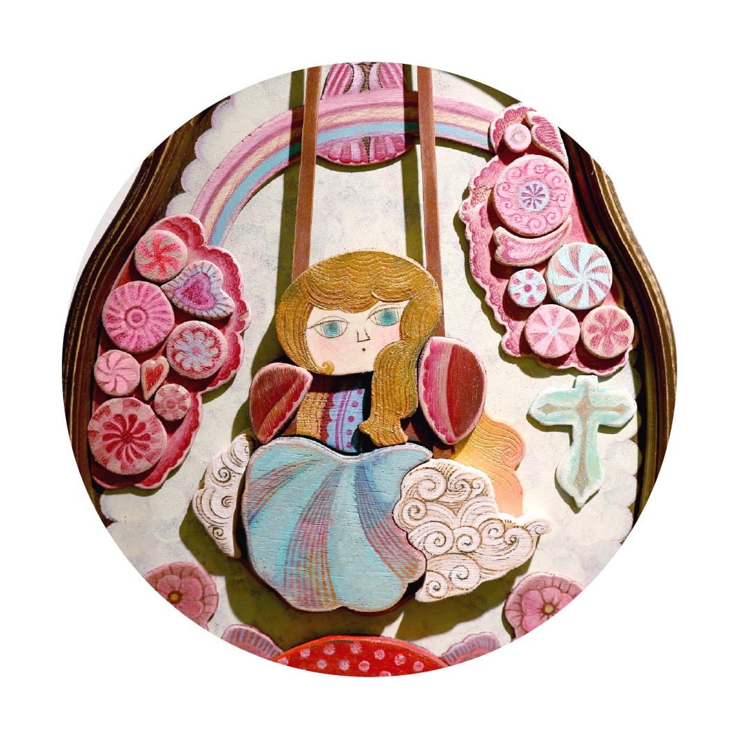 端材や廃材をパズルのように組み合わせて生まれた、半立体作品の組木絵。