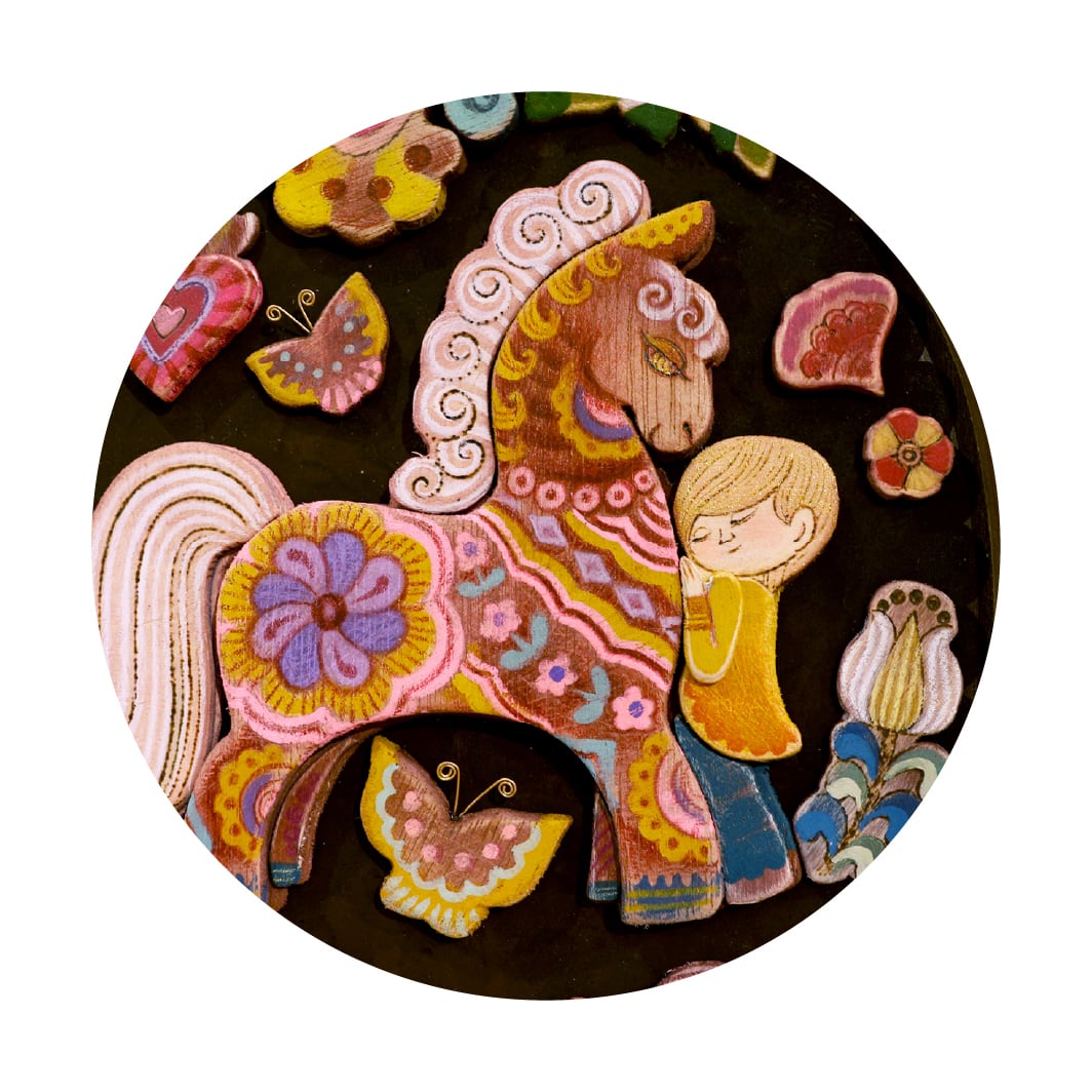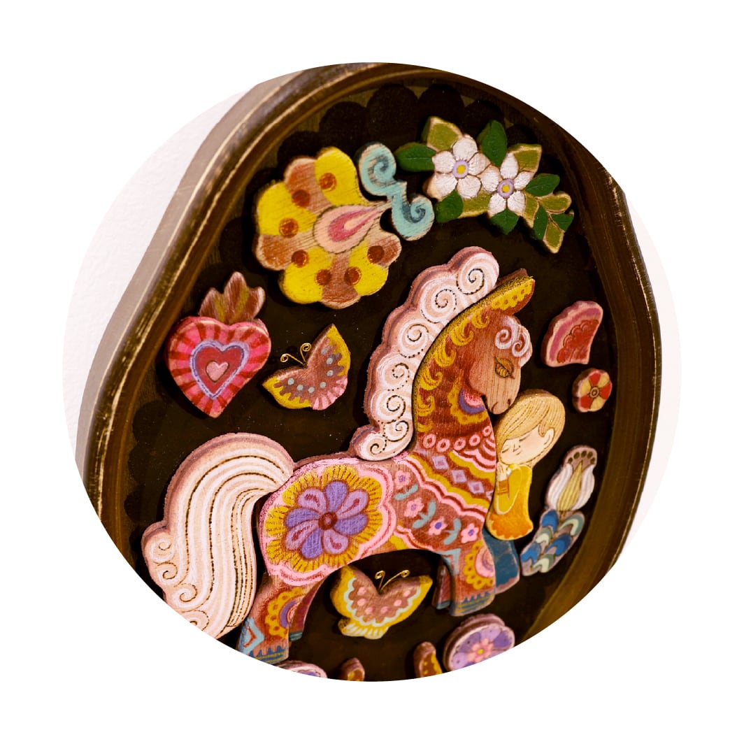 端材や廃材をパズルのように組み合わせて生まれた、半立体作品の組木絵。