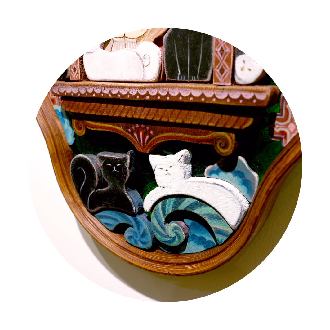 端材や廃材をパズルのように組み合わせて生まれた、半立体作品の組木絵。