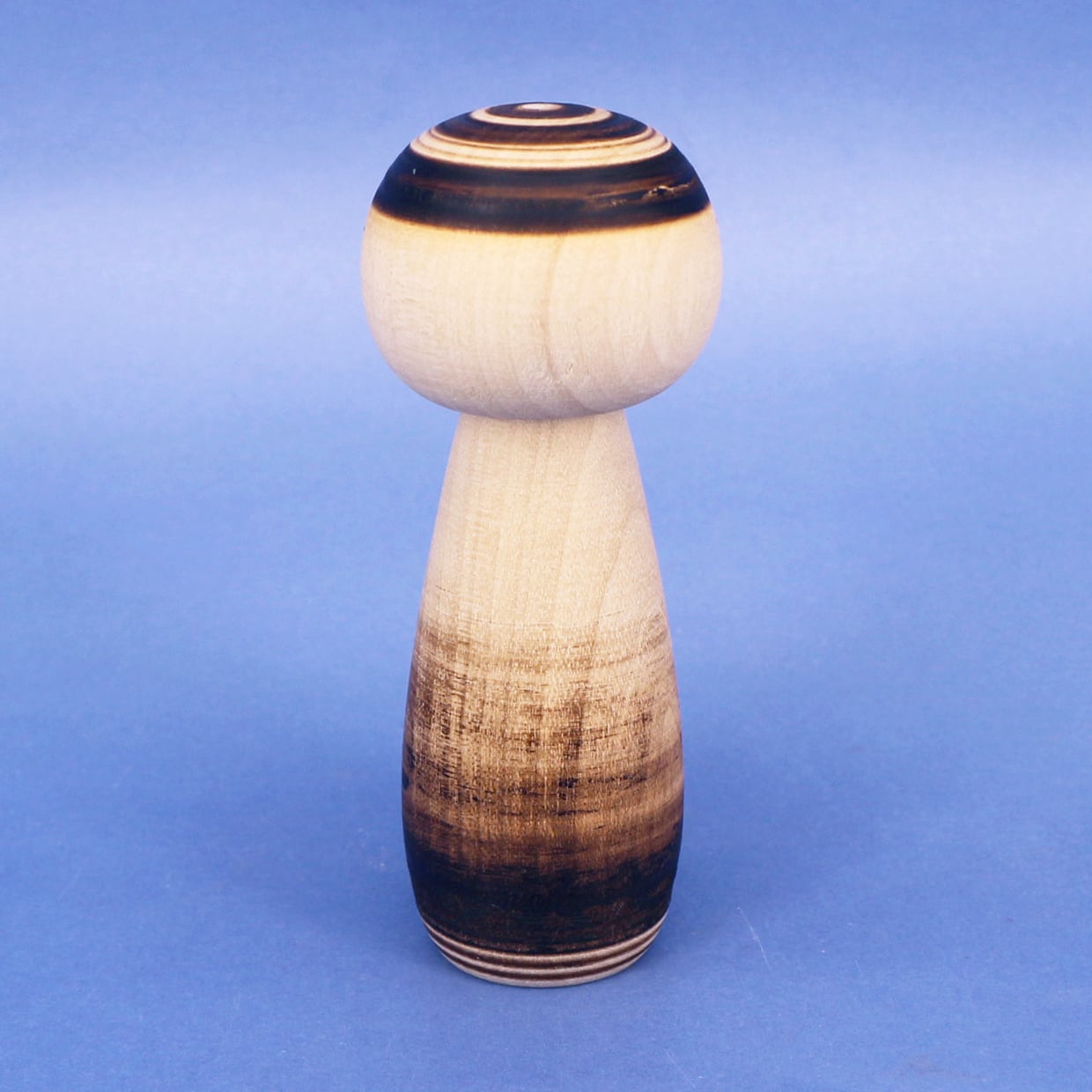 「KOGESHI」と名付けられた焼き絵こけしは、ロクロでこけしを回転させながら、木っ端を当てることで木を焦がし模様を描いています。