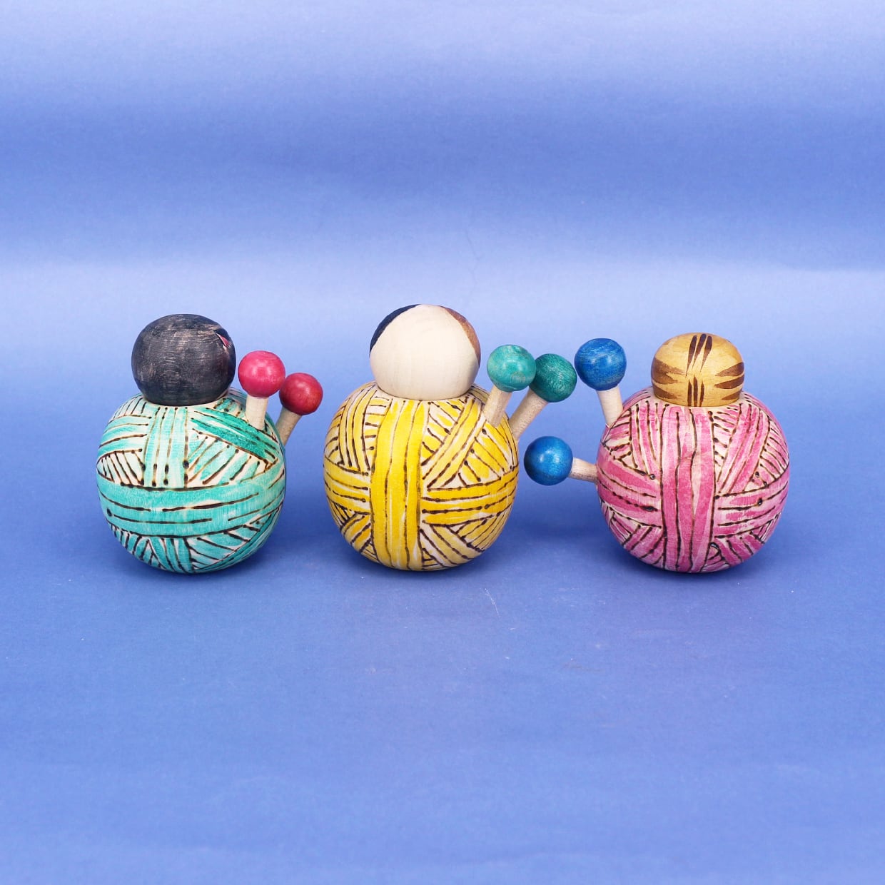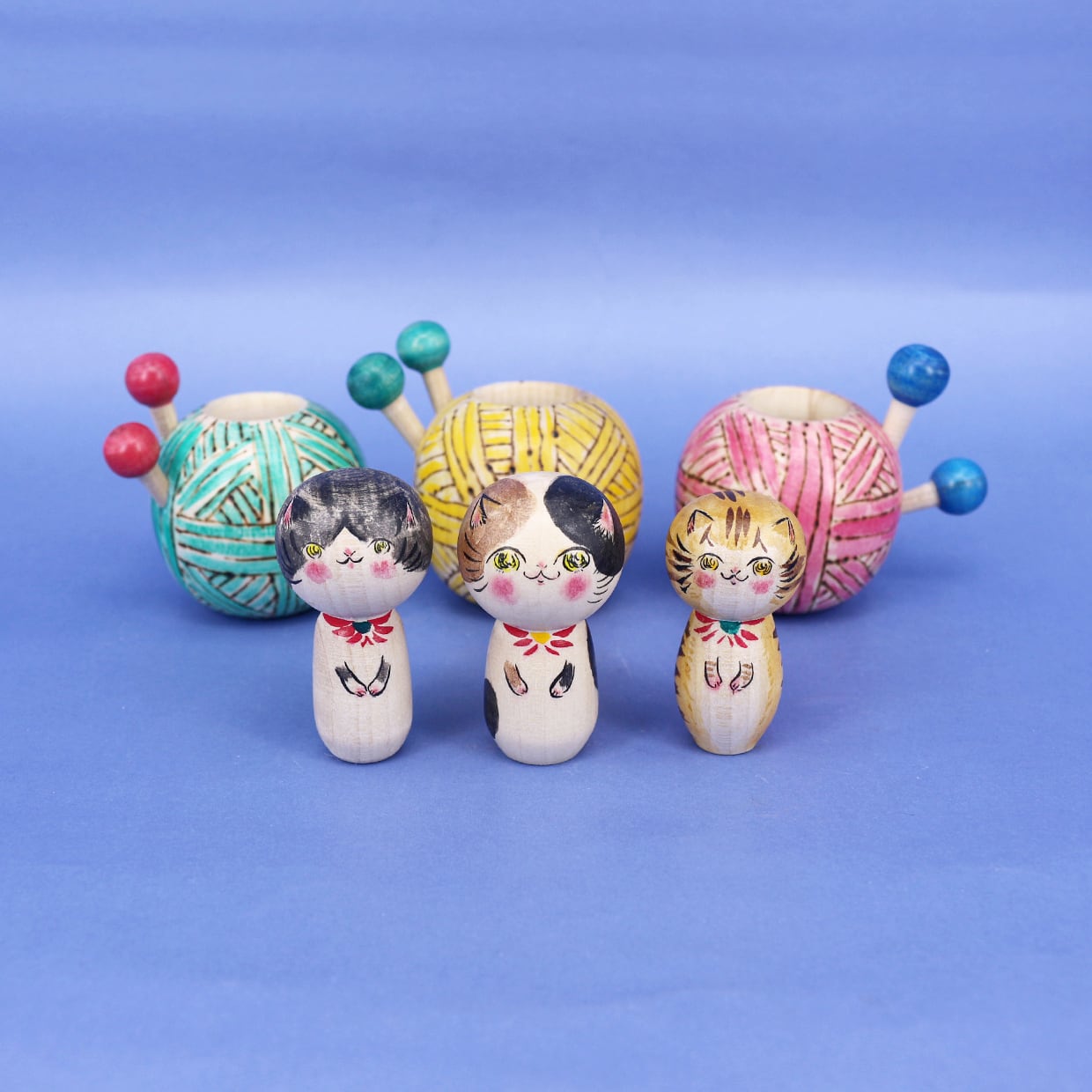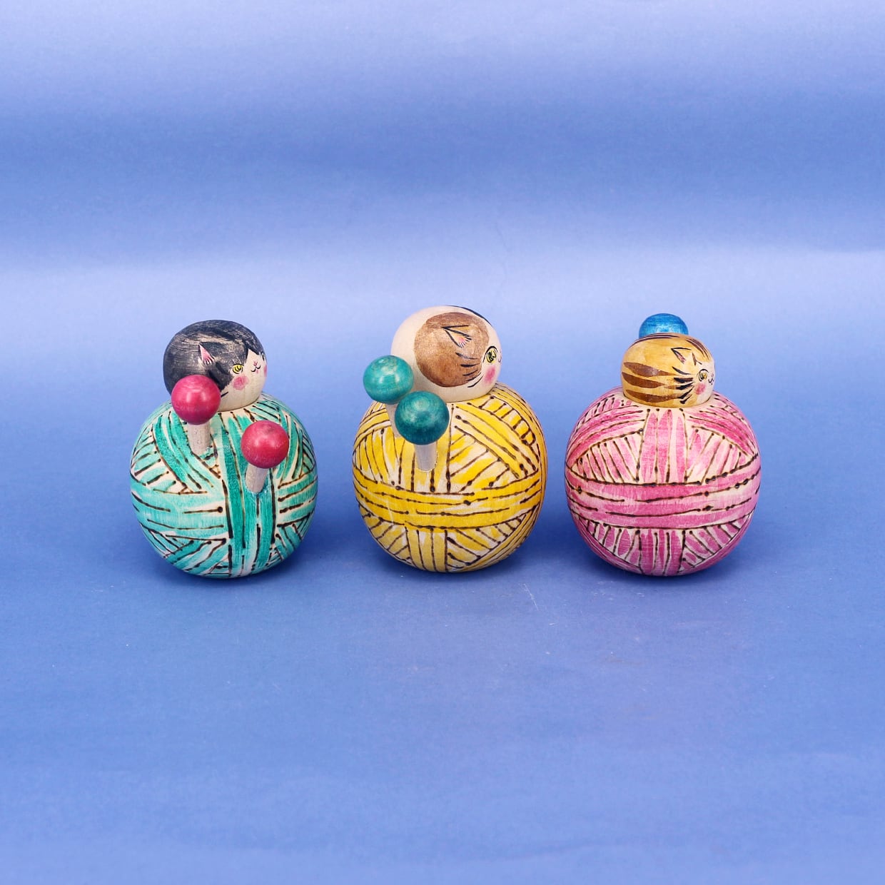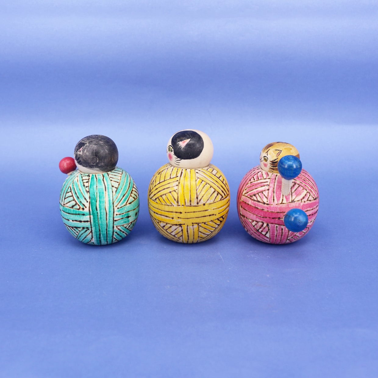 カラフルな毛糸玉の中から、小さな猫こけしが出てきます。
