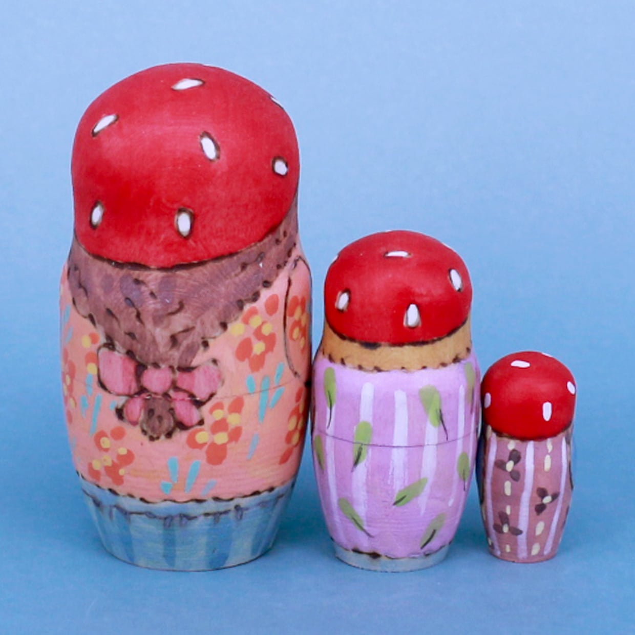 絵本の中の一場面が表現されたようなこのマトリョーシカは、ぜひきのこ好きの方にオススメしたい作品になっています。