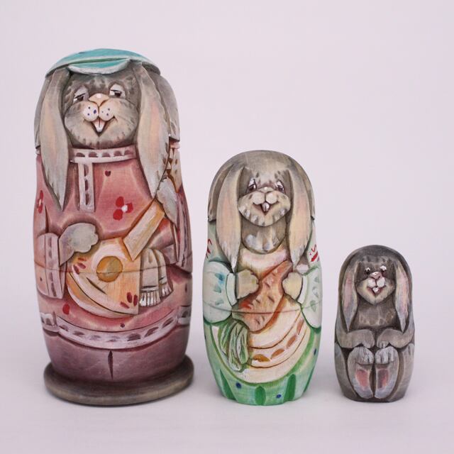 モスクワ郊外のオレホヴォ・スエヴォにある、コブロフ工房で作られたウサギのマトリョーシカ。