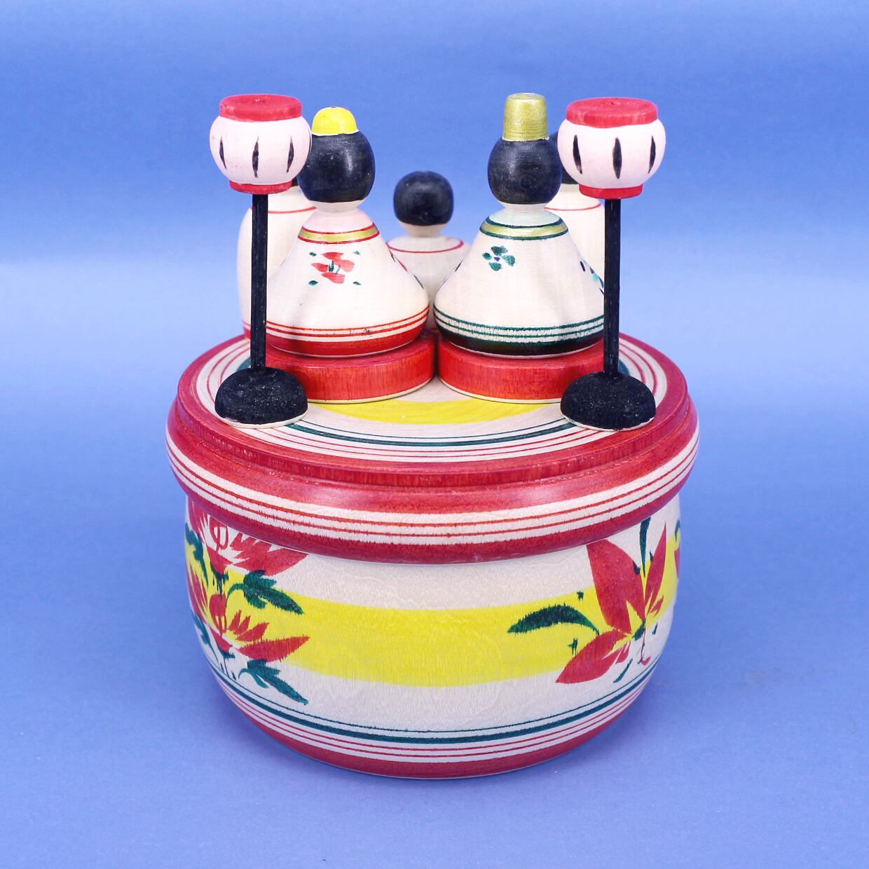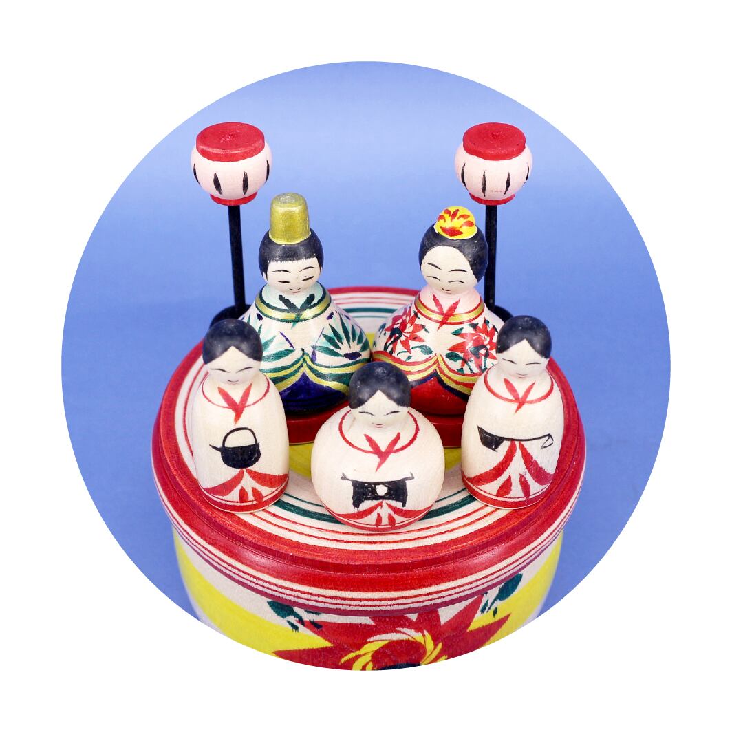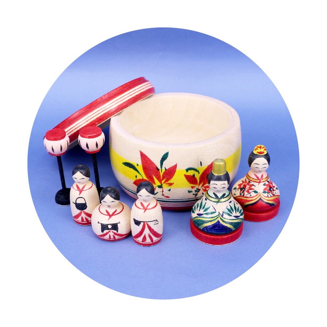 小さなひな飾り一式が、丸い入れ物の中に全て収納できるように作られています。