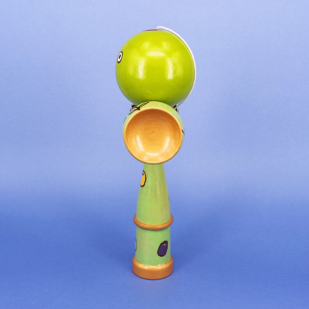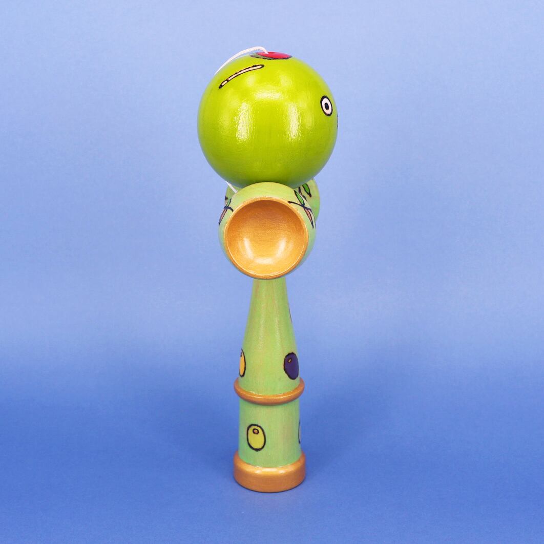 まんまるなお顔とキレイなオリーブグリーンが印象的な、けん玉のオブジェ。