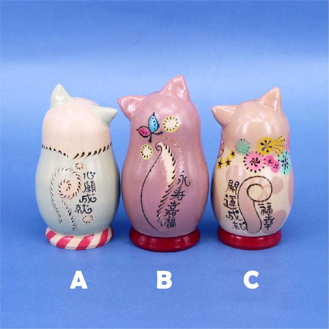 花輪を持ってお祈りしているようなふくにゃんの背面には「心願成就」、カラフルな花束を持つふくにゃんの背面には「永寿嘉福」、万歳するように両手で招いてるふくにゃんの背面には「開運成就」「福幸」の文字がそれぞれ描かれています。