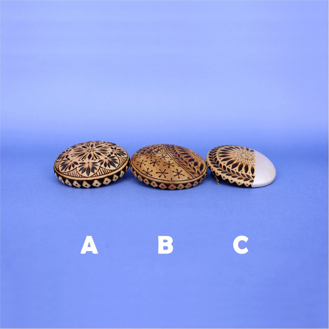 ひとつひとつ異なる焦がし模様が美しい、幾何学模様のブローチ。