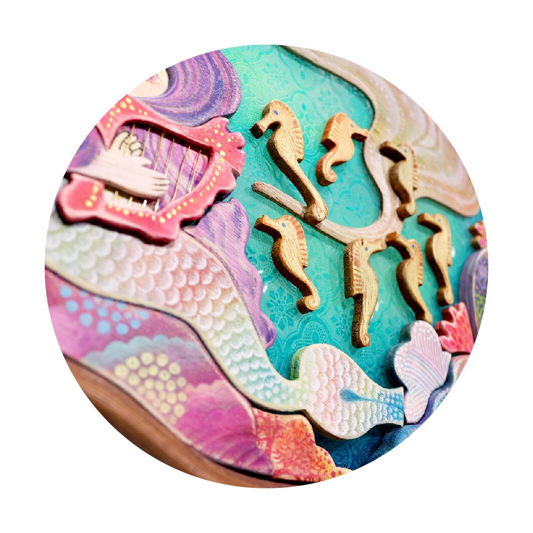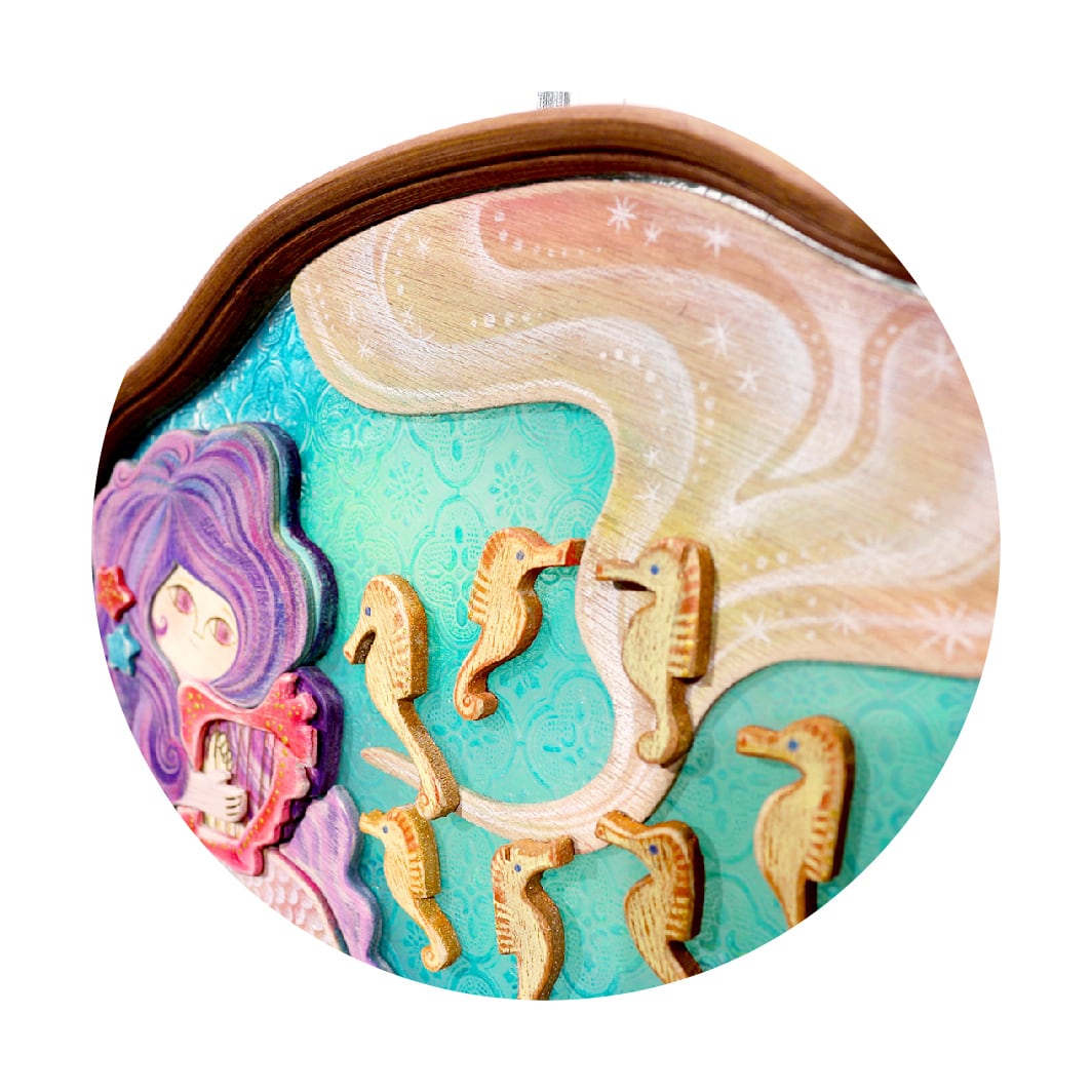 端材や廃材をパズルのように組み合わせて生まれた、半立体作品の組木絵。