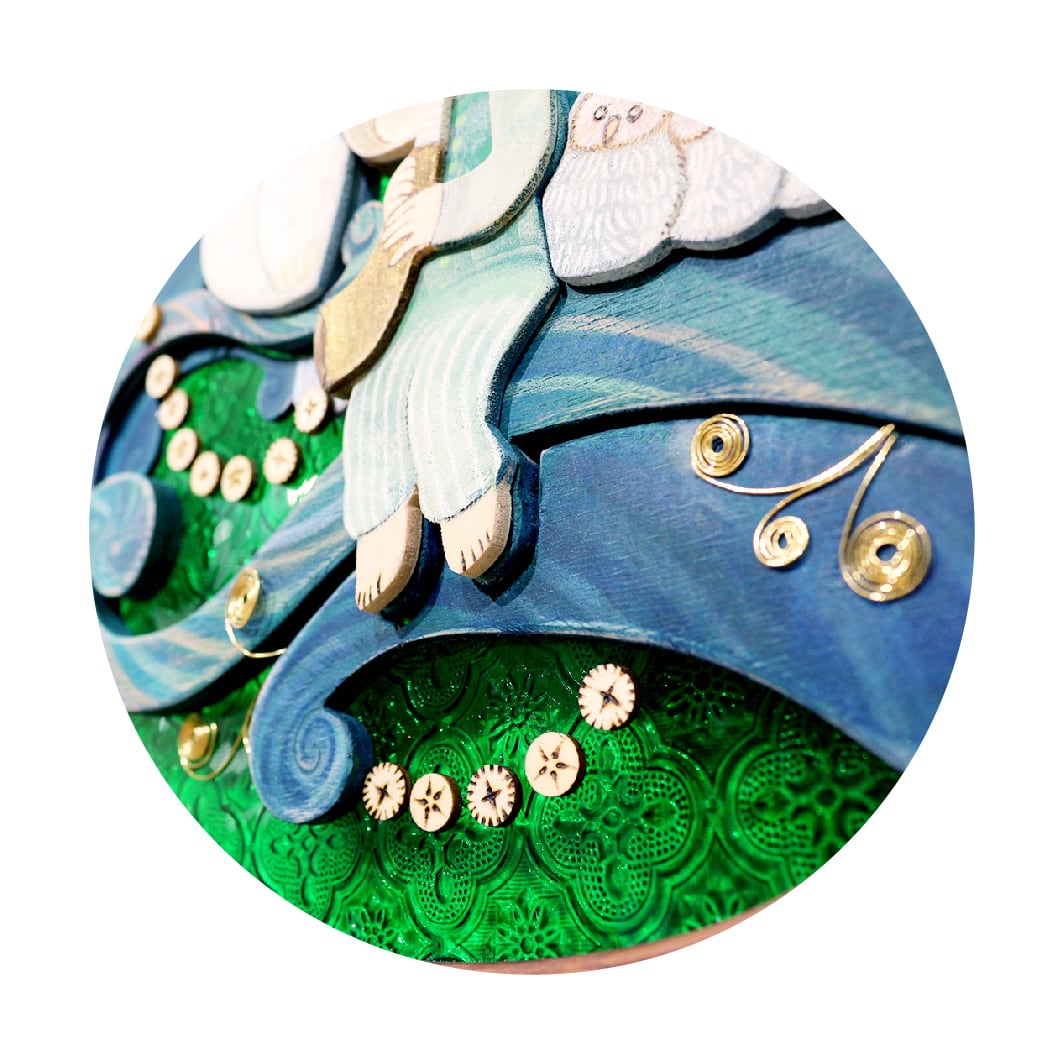 端材や廃材をパズルのように組み合わせて生まれた、半立体作品の組木絵。