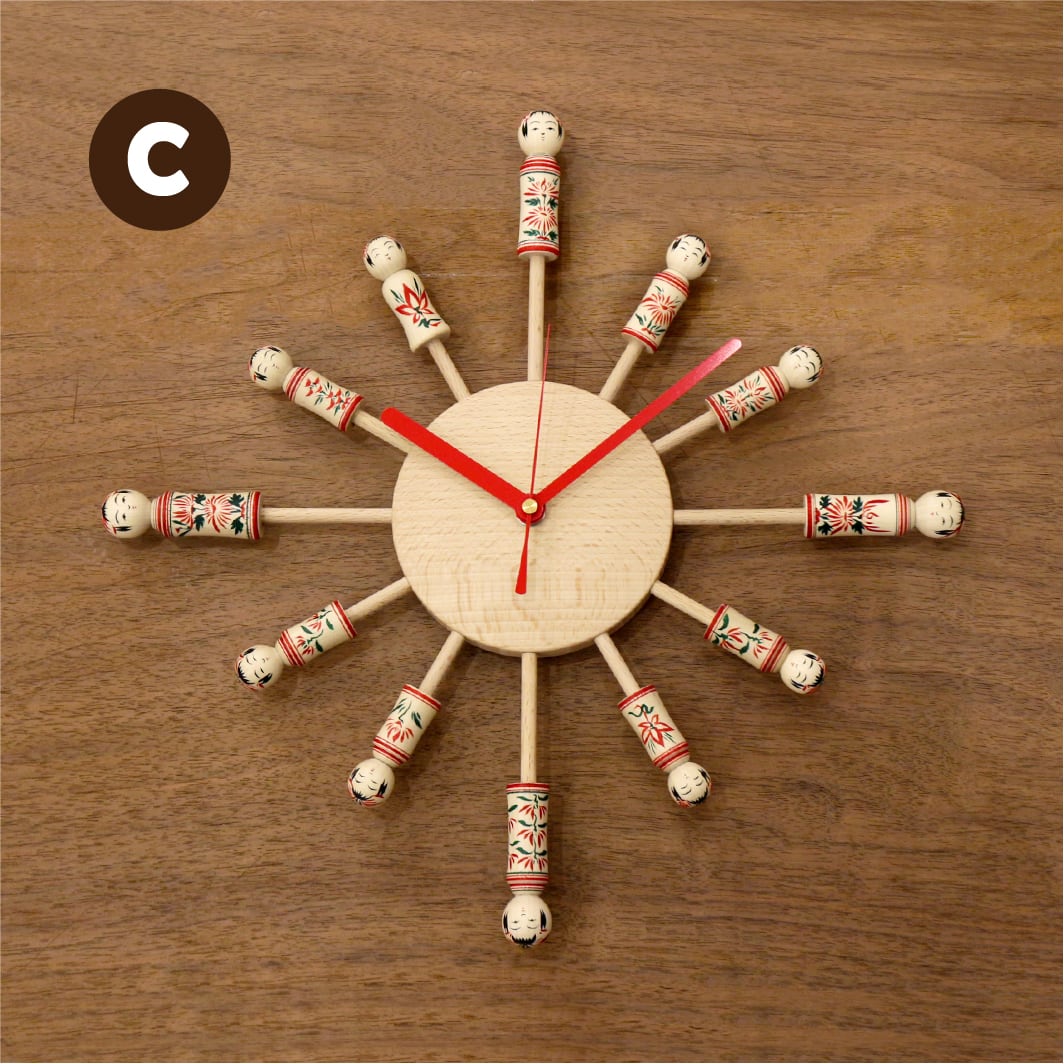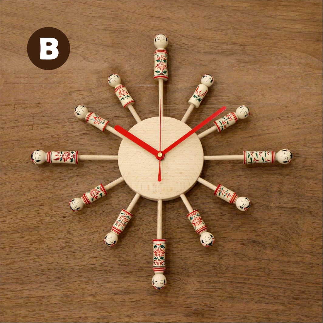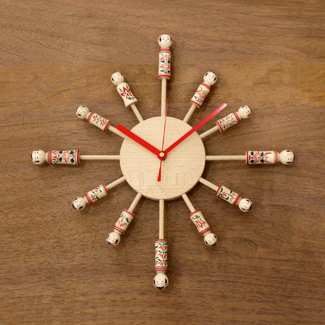 木工雑貨の工房 木とり舎さんにご協力いただき、鳴子こけしの早坂利成 工人のこけしを使用して制作された、オリジナルデザインの時計です。