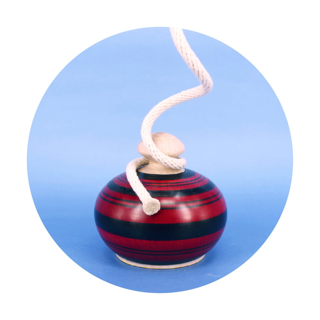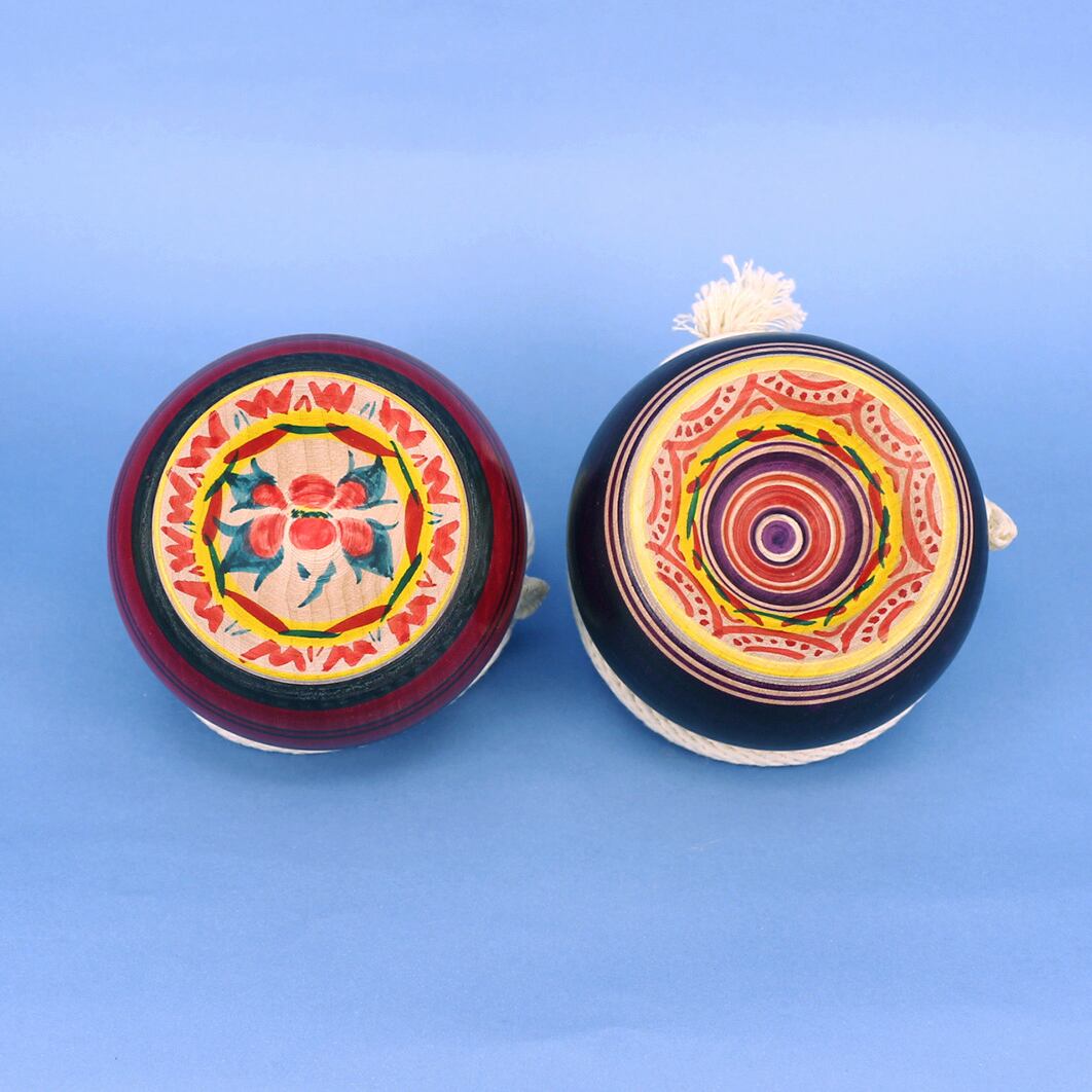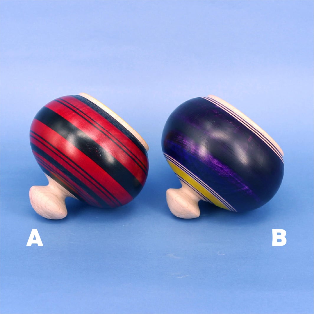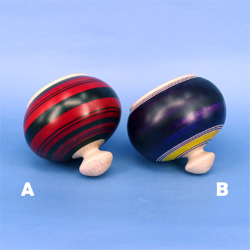 普通の独楽(こま)と違い、雪の上でも回るように軸の部分が太く丸みを帯びていて、すり撥型の内側にはロクロ模様で彩色されています。